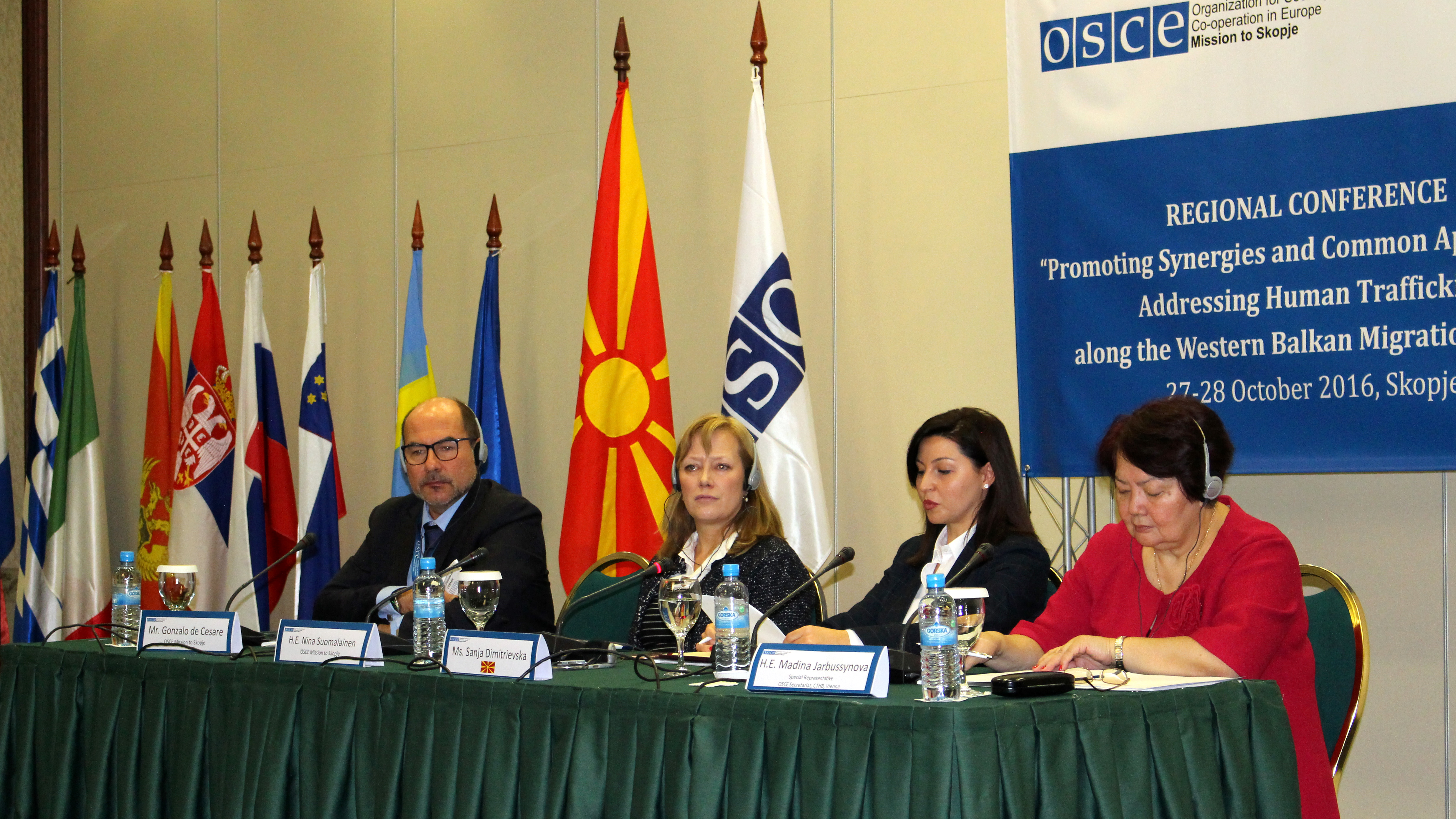 Ambassador Nina Suomalainen (c), Head of the OSCE Mission to Skopje, speaking at the conference on addressing human trafficking along Western Balkan migration routes, Skopje, 27 October 2016.