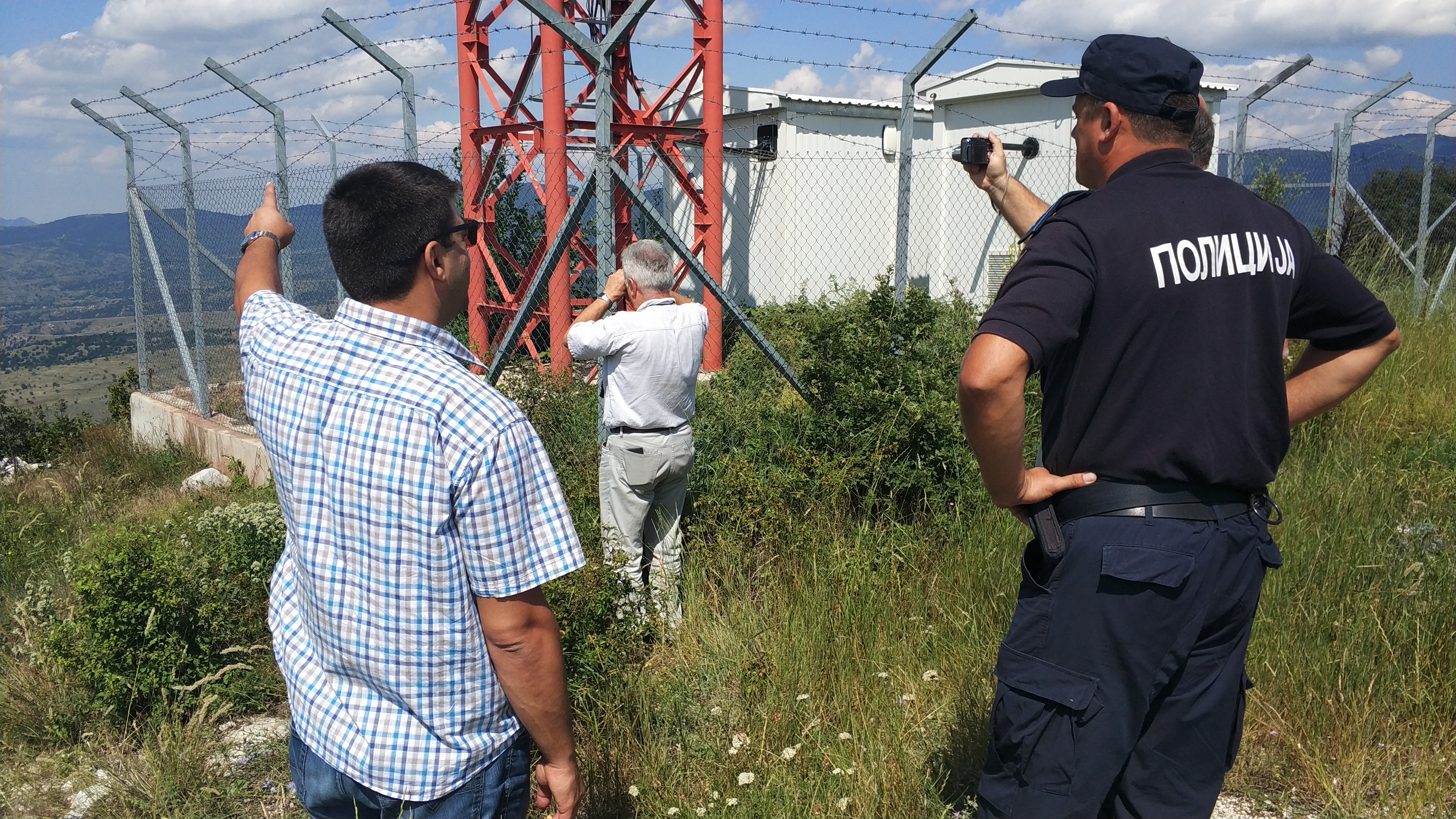 Engineers and representatives of the Interior Ministry are checking the visibility for microwave data transmission from the mast in Polchishte village to Vitolishte border police station, Prilep municipality, 18 July 2018.