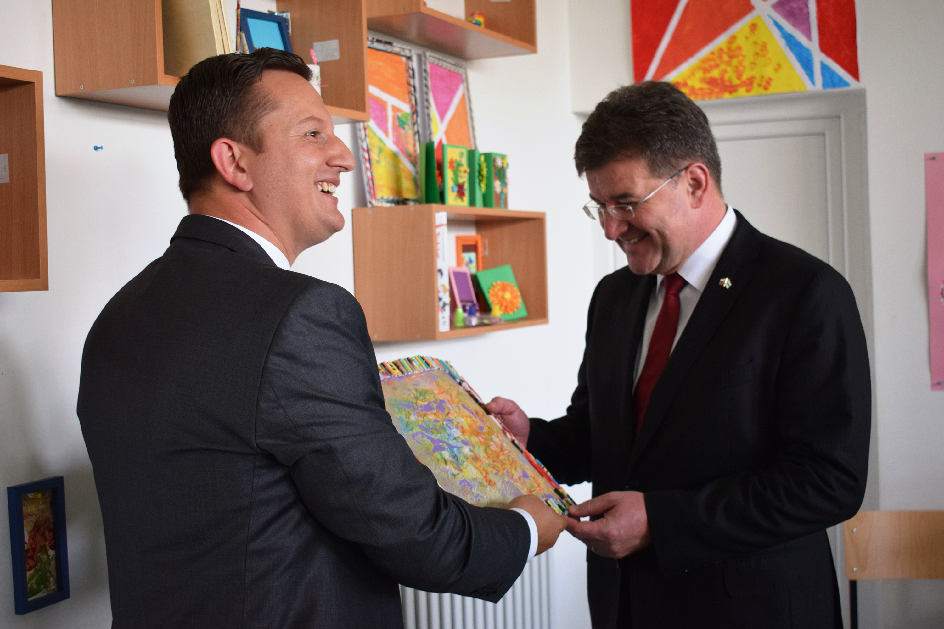 Director Ejupi (l) expresses gratitude to Chairperson Lajčák for OSCE support to the Institute, Skopje, 19 June 2019.