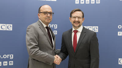 H. E. Jaume Serra Serra (l), Ambassador and Permanent Representative of Andorra to the OSCE, with OSCE Secretary General Thomas Greminger, Vienna, 13 January 2020.