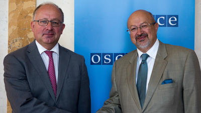 H. E. Ambassador Eberhard Pohl (l), Permanent Mission of Germany to the OSCE in Vienna, and the OSCE Secretary General Lamberto Zannier, Vienna, 3 September 2015.