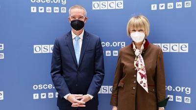 H.E. Anne-Marie Callan, Ambassador and Permanent Representative of Ireland to the OSCE, with OSCE Secretary General Helga Maria Schmid, Vienna, 18 January 2022.