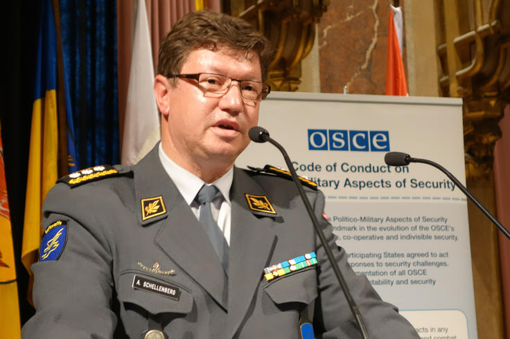 Commander of the Swiss Air Force, Lieutenant General Aldo C. Schellenberg, speaking at a commemorative event at the Military History Museum of the Austrian Armed Forces to mark 20 years of the OSCE Code of Conduct on Politico-Military Aspects of Security, Vienna, 8 July 2014.