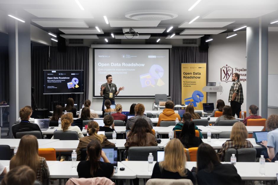 Participants during a session on the open data roadshow for journalism and business students in Lviv, 23 September 2025.