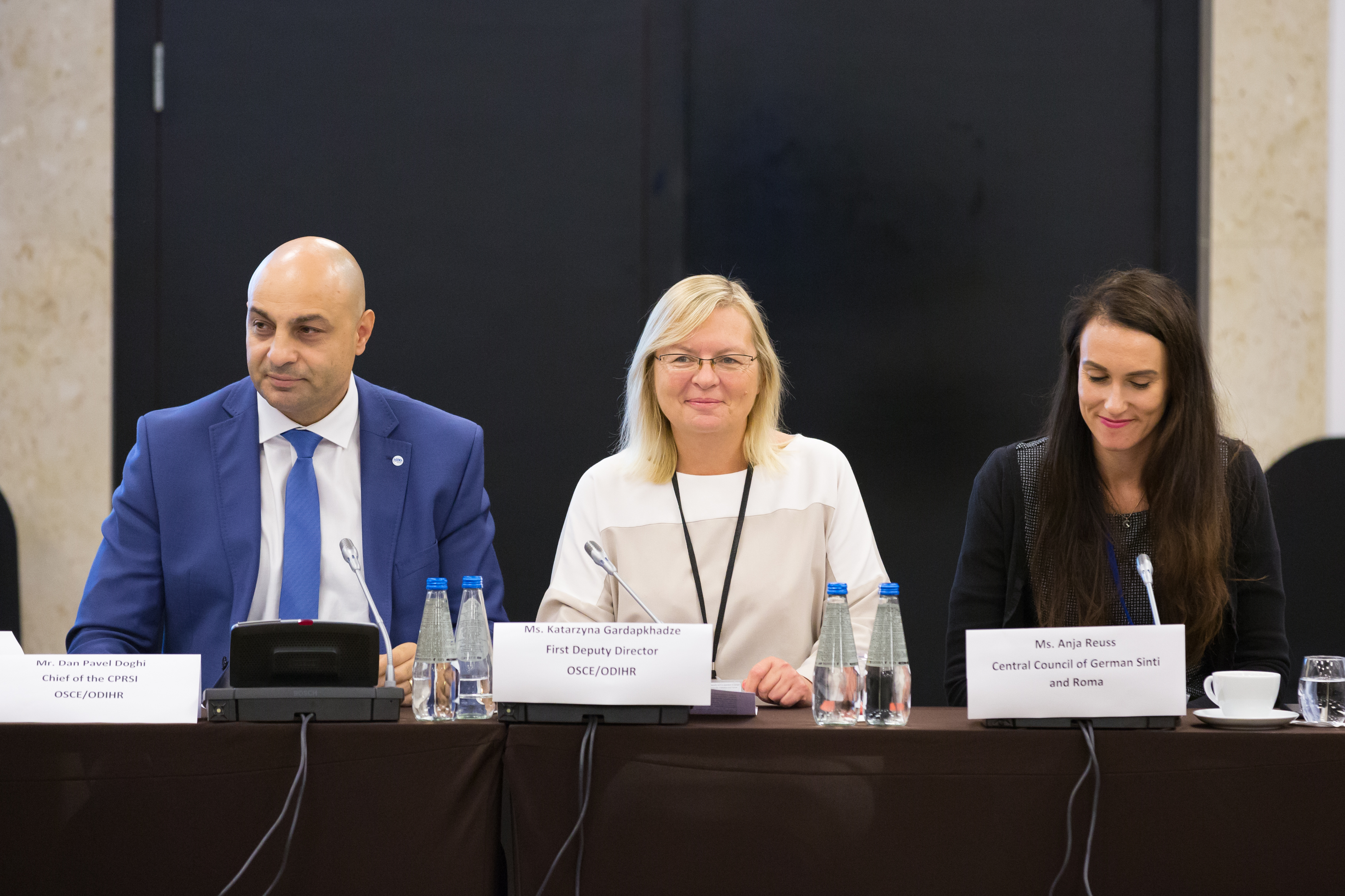 Dan Pavel Doghi, Chief of the ODIHR Contact Point for Roma and Sinti Issues (l), Katarzyna Gardapkhadze, ODIHR's First Deputy Director (c) and Anja Reuss, Political Adviser at the Central Council of German Sinti and Roma (r) during an event on Roma and Sinti issues held on the margins of the 2018 Human Dimension Implementation Meeting. Warsaw, 14 September 2018.