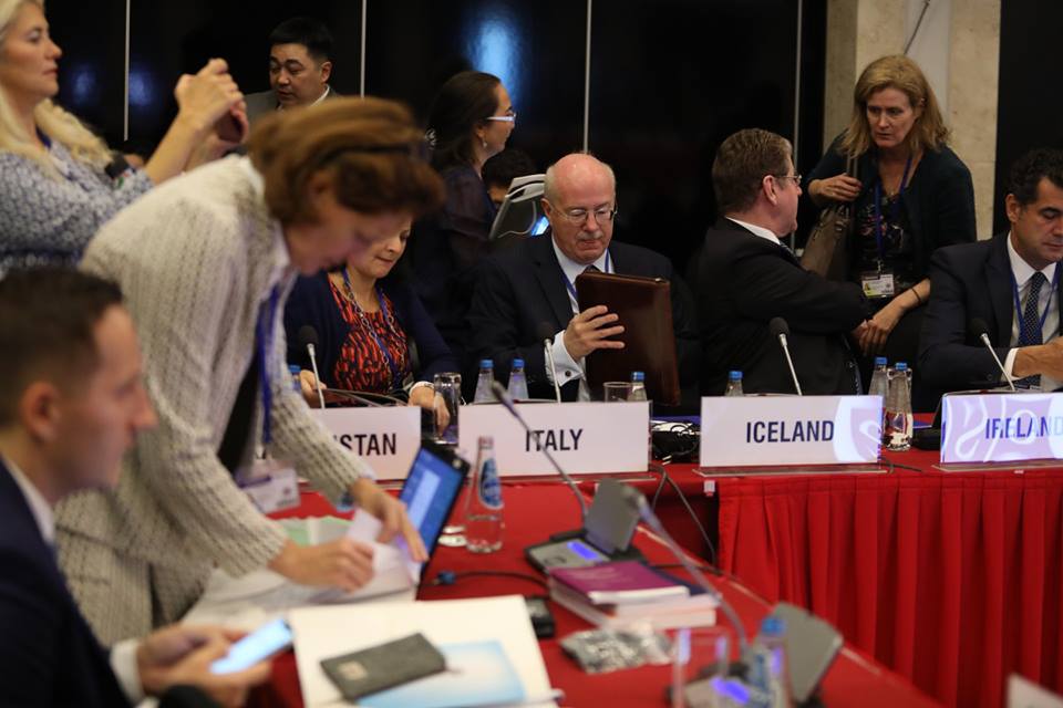 Representatives of OSCE participating States prepare for the opening of the 2018 Human Dimension Implementation Meeting, 10 September 2018, Warsaw.
