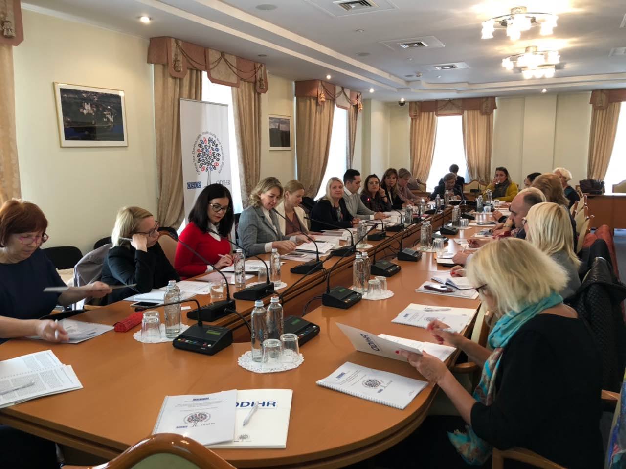 Participants in a meeting hosted by the Equal Opportunities Caucus of Ukraine’s parliament discuss a new ODIHR report examining the effectiveness of regional gender equality mechanisms in Ukraine. Kyiv, 12 October 2018.