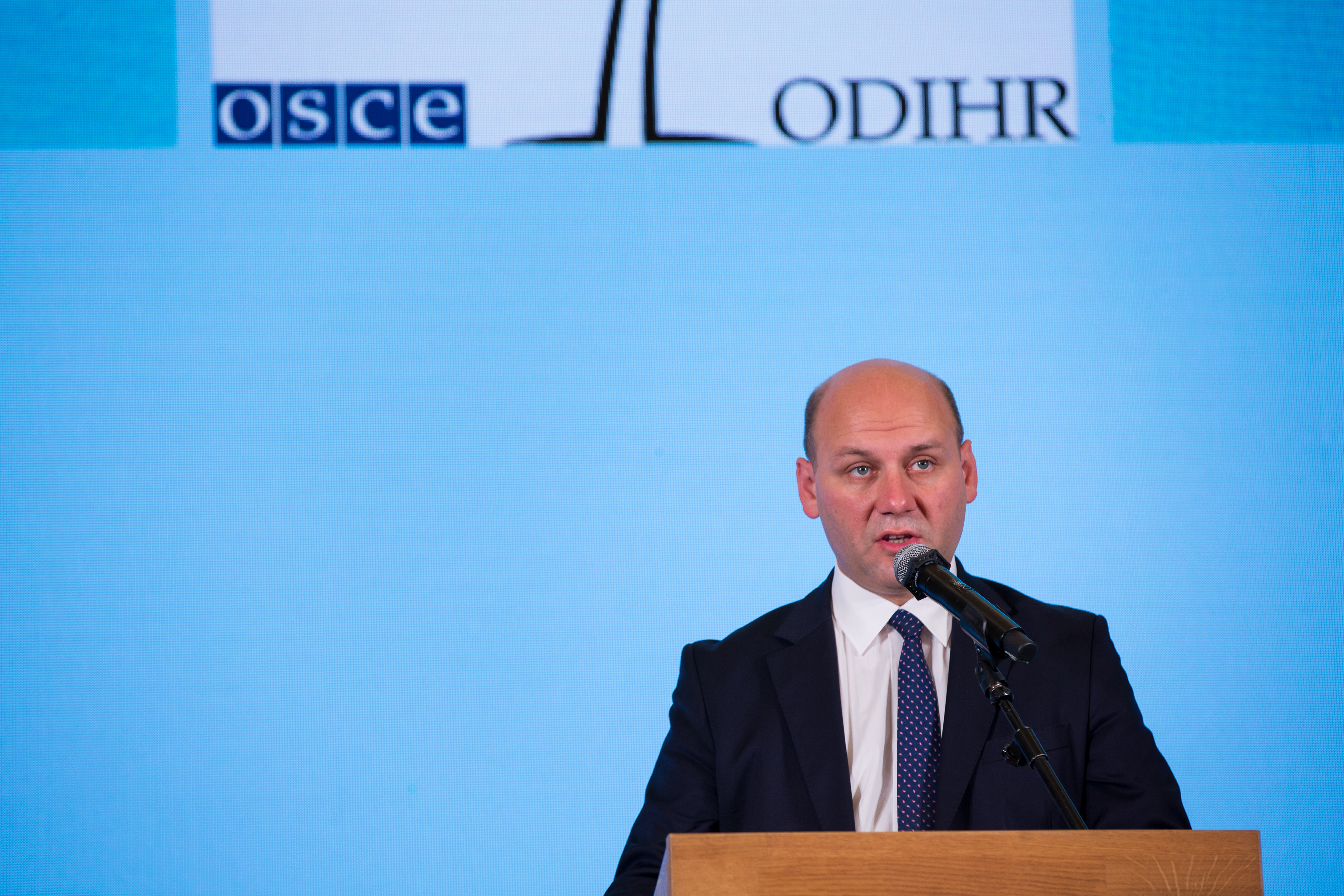 Szymon Szynkowski vel Sęk, Deputy Minister of Foreign Affairs of Poland, delivering opening remarks at ODIHR's 30th anniversary conference. Warsaw, 14 October 2021.