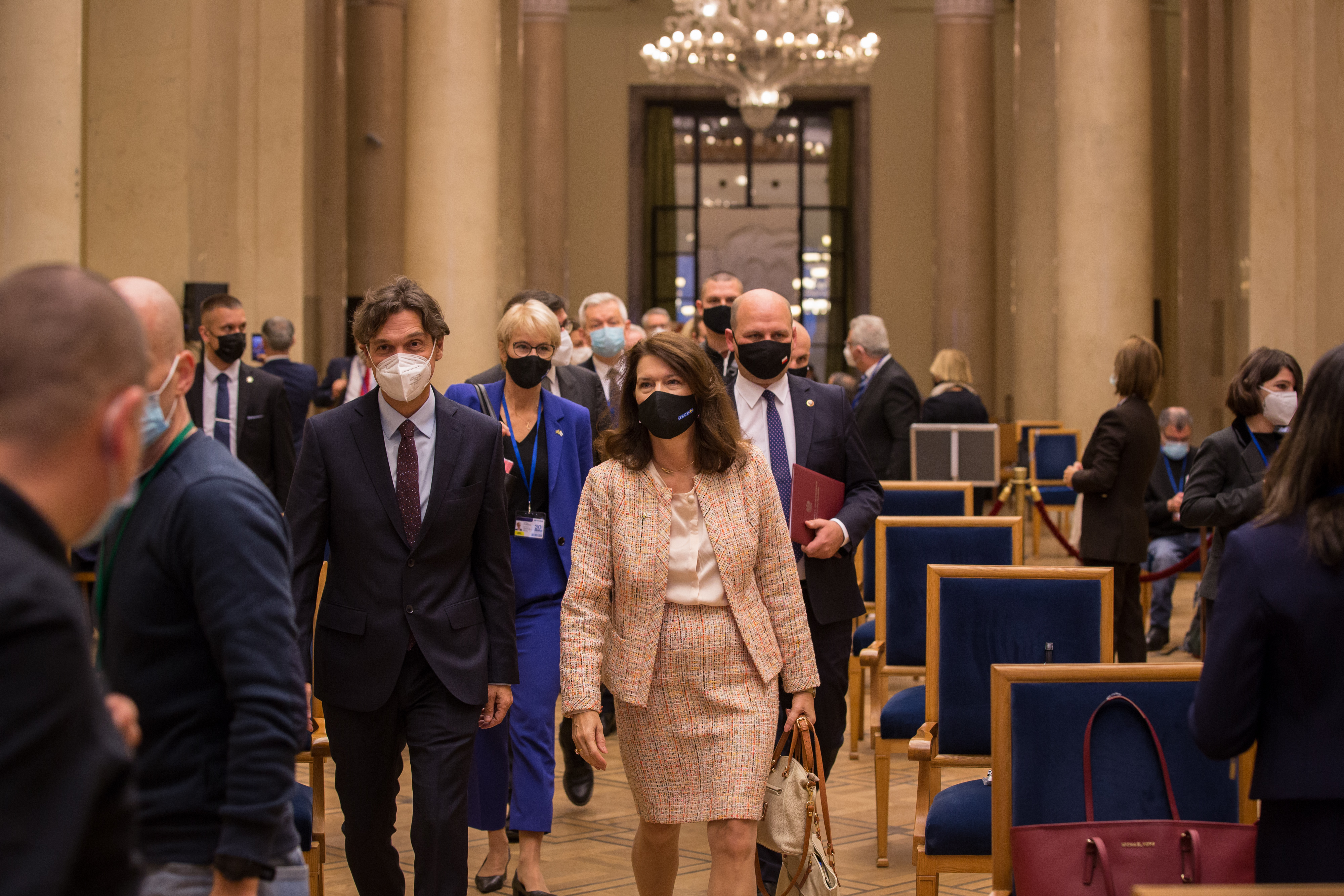 Matteo Meccaci, ODIHR Director (left) and Ann Linde, OSCE Chairperson-in-Office and Minister of Foreign Affairs of Sweden (right) arriving at the venue of ODIHR's 30 anniversary conference. Warsaw, 14 October 2021.