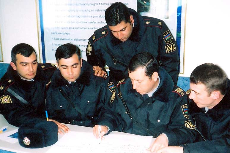 Azeri police officers discuss domestic violence at a training course at the police academy in Baku, March 2007.