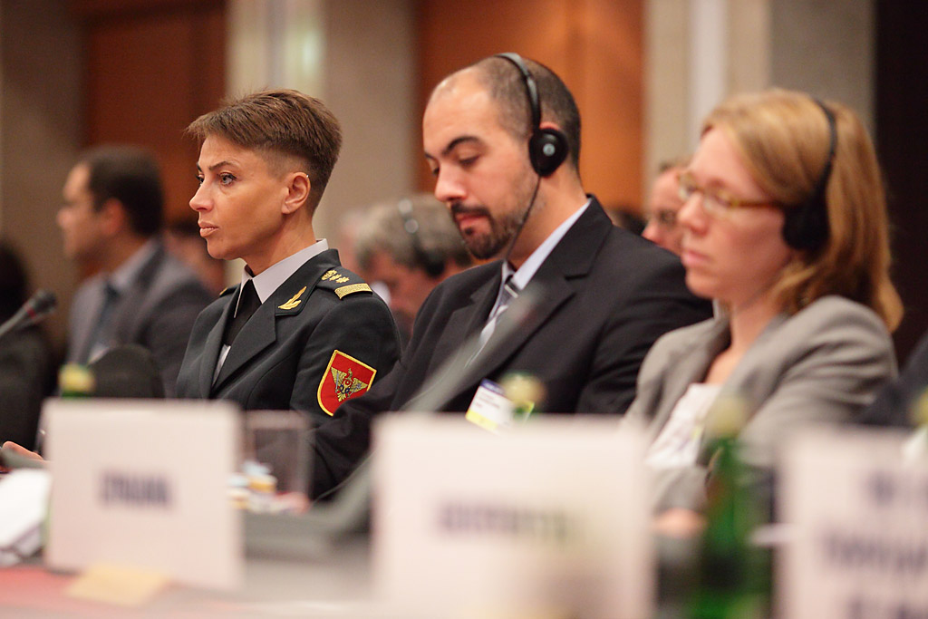 Lieutenant Colonel Olga Scripovscaia (left), Commander of the Military Territorial Recruiting Center in Balti, Moldova and a former peacekeeper in Liberia, at the session on equal opportunity for women and men at the OSCE Human Dimension Implementation Meeting in Warsaw, 6 October 2011.