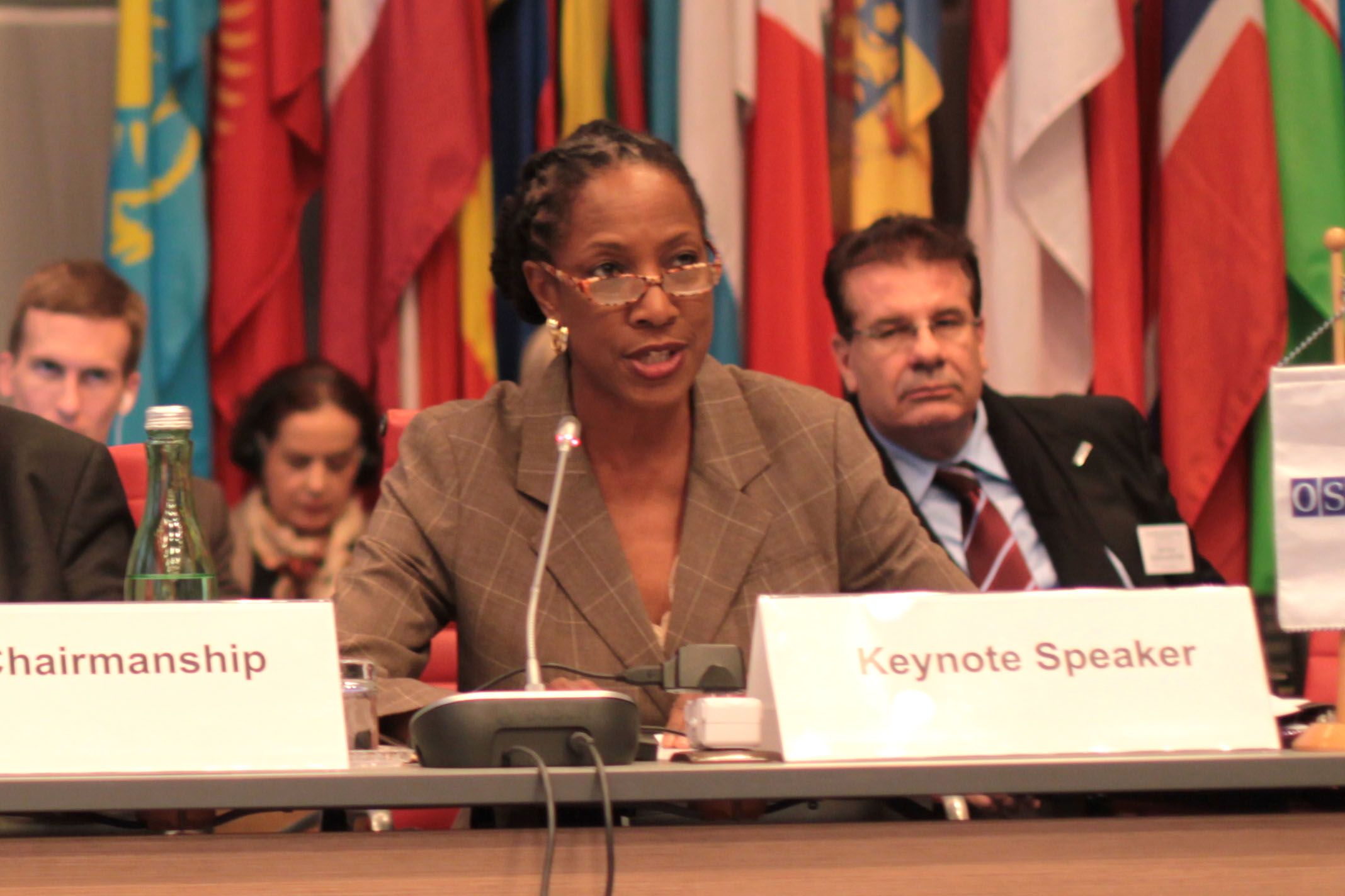 Keynote speaker Joia Jefferson Nuri, a prominent human rights activist from the United States in the area of human rights advocacy and protection, addresses participants of the Supplementary Human Dimension Meeting on Combating Racism, Intolerance and Discrimination in Society through Sport. Vienna, 19 April 2012.