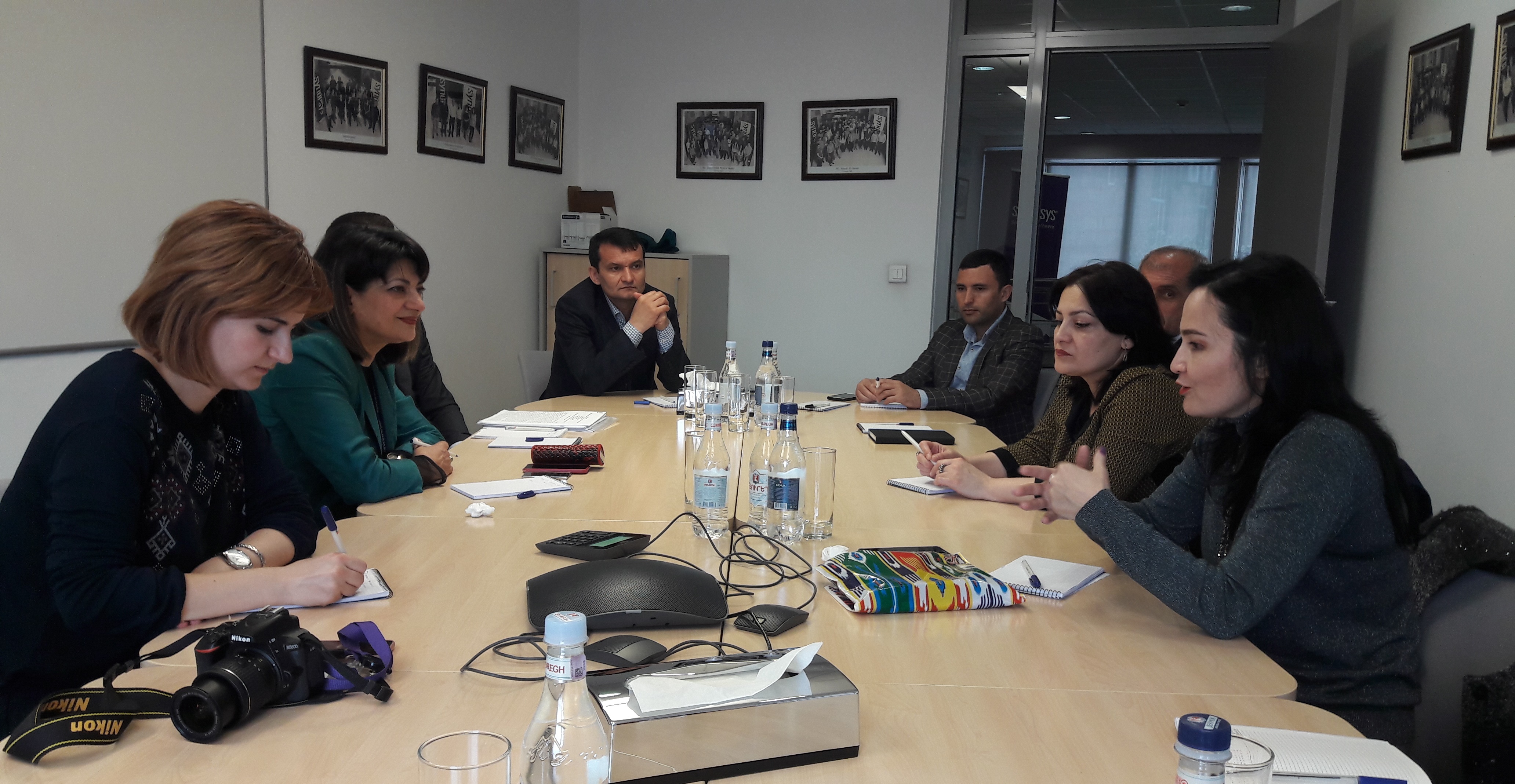 Manizha Muhammad (r), Director of Sifat Innotech Invest Сompany, and Gayane Markosyan (centre-left), Public Affairs and Communication Manager of Synopsys Armenia, discussing steps taken towards digitalization of economy in Tajikistan, Yerevan, 17 April 2019.
