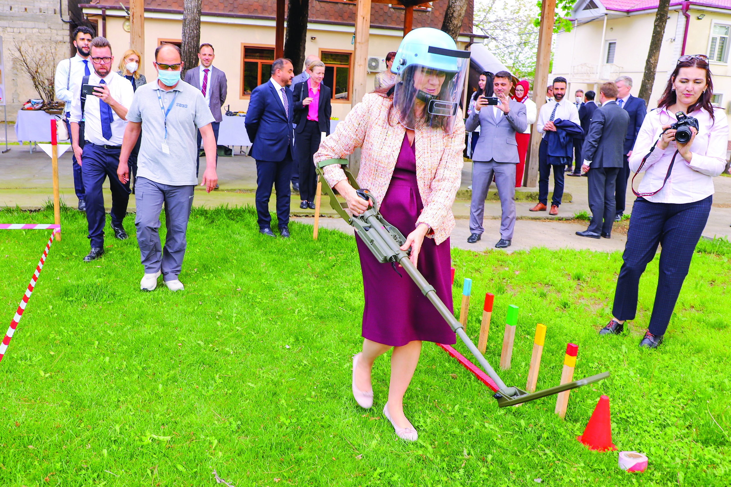 Ann Linde, OSCE Chairperson-in-Office and Swedish Minister for Foreign Affairs, trying a mine detector used for work in areas contaminated with mines and explosive remnants of war, Dushanbe, 15 April 2021.