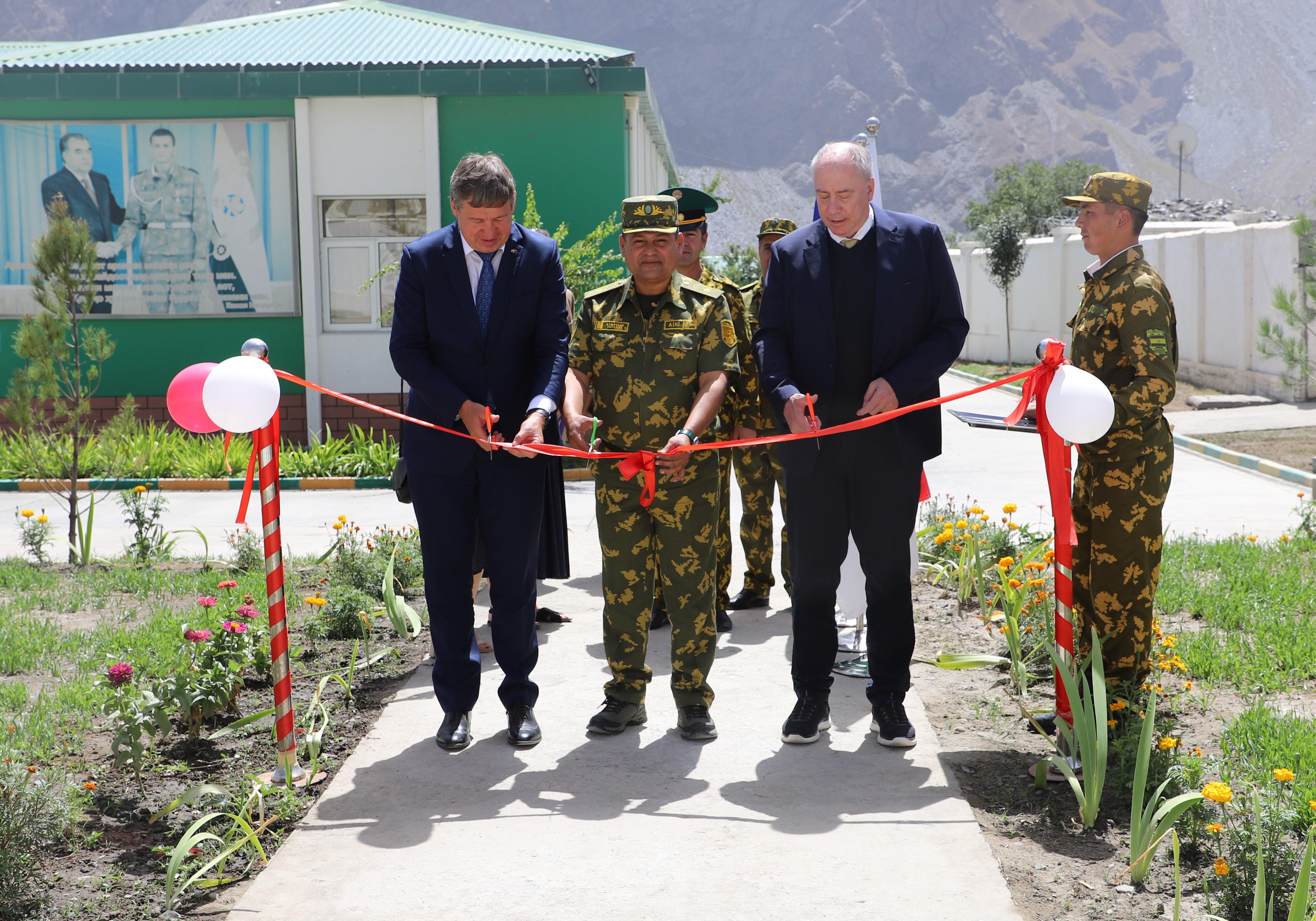(l-r) Ambassador Raimundas Karoblis, Head of the EU Delegation to Tajikistan, General-Major Dilshod Toirzoda, Deputy Commander of the Tajik Border Troops and Ambassador Willy Kempel, Head of the OSCE Programme Office in Dushanbe during the official opening ceremony of five pre-fabricated containers at Rushan Border Detachment in the Gorno-Badakhshan Autonomous Region, 20 August 2024.