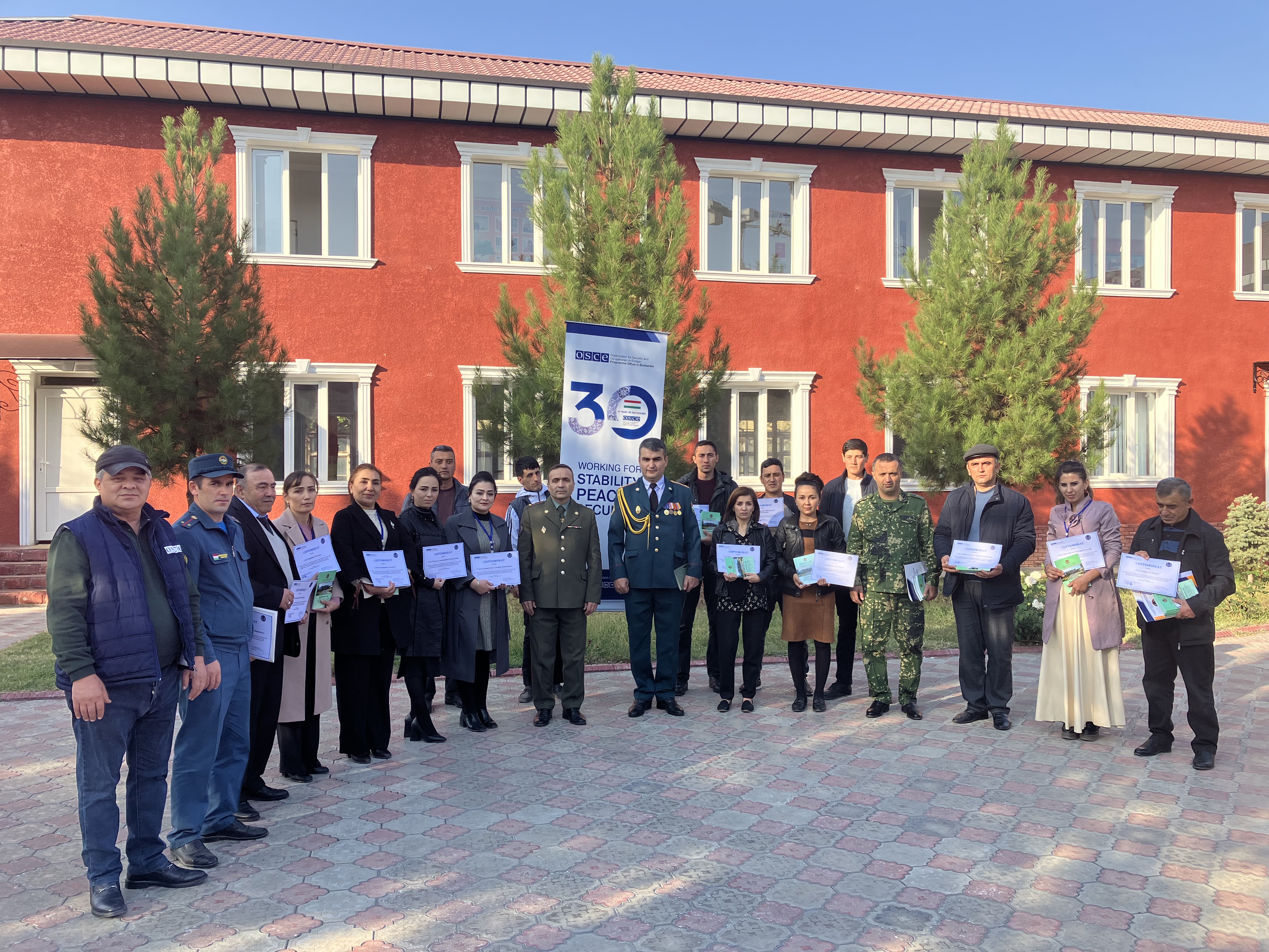 Representatives from the Republican Training and Methodological Centre of Tajikistan’s Committee of Emergency Situations and Civil Defence, along with OSCE officials, gather for a group photo during a three-day training course in Khujand, Sughd region, 2 November 2024.