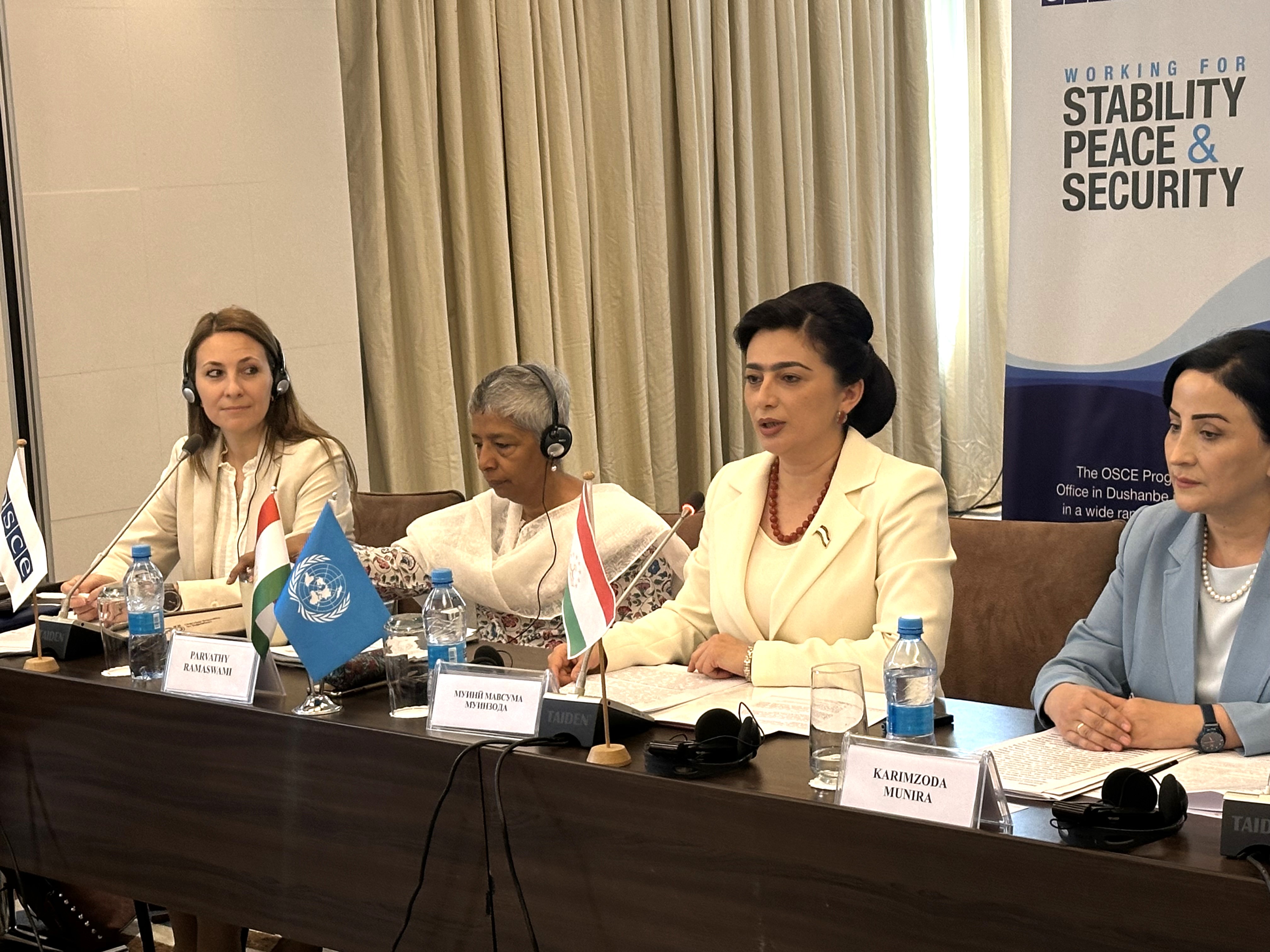 (Left to right) Tatiana Turcan, Acting Head of the OSCE Programme Office in Dushanbe; Parvathy Ramaswami, United Nations Resident Coordinator in Tajikistan and Mavsuma Muini, Vice Speaker of the Lower Chamber of Tajikistan’s Parliament, at the coordination meeting of newly elected women parliamentarians and development partners, Dushanbe, 20 May 2025.