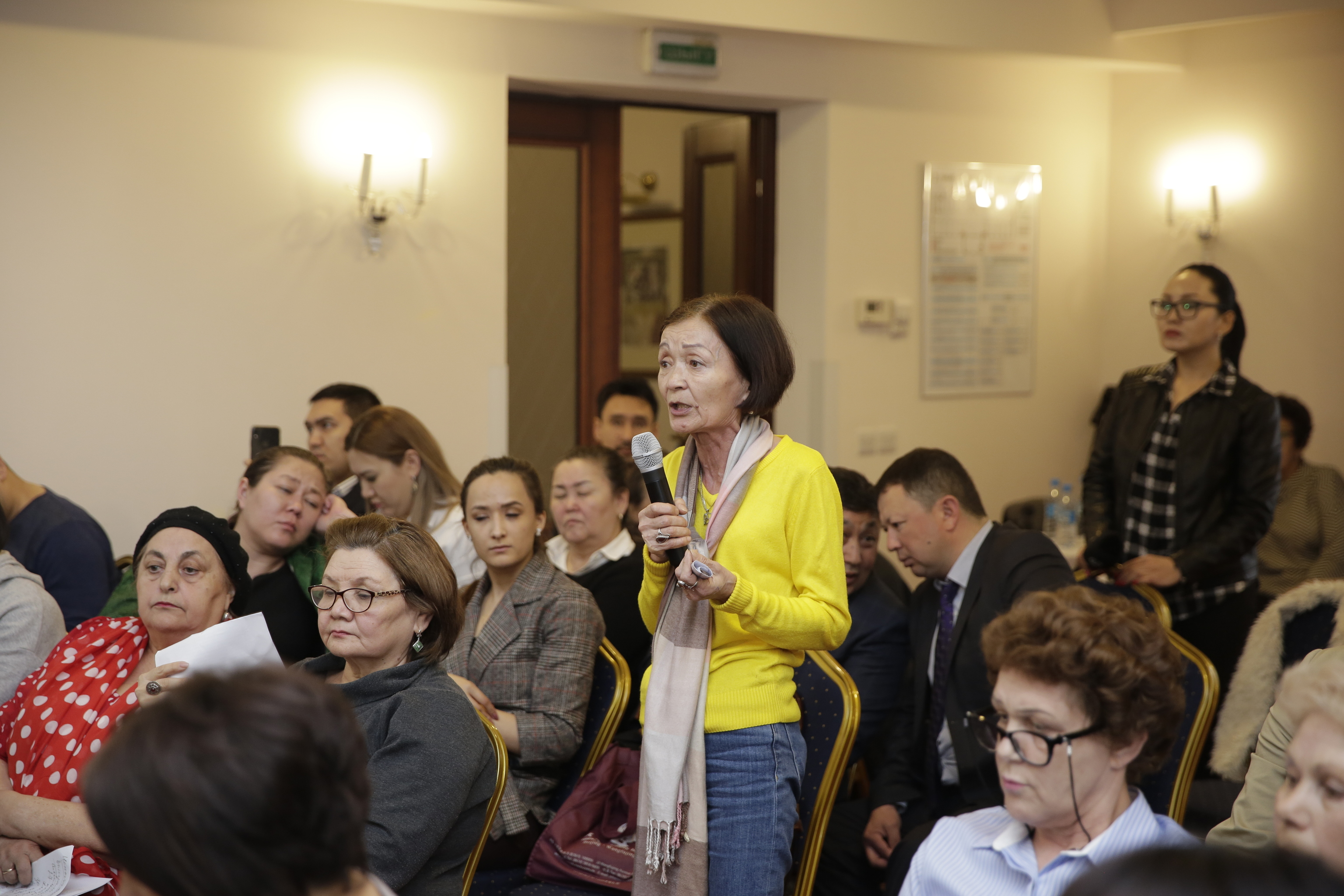 Participants discussing the possible causes of the fish death in Ural River, Atyrau, 3 April 2019.