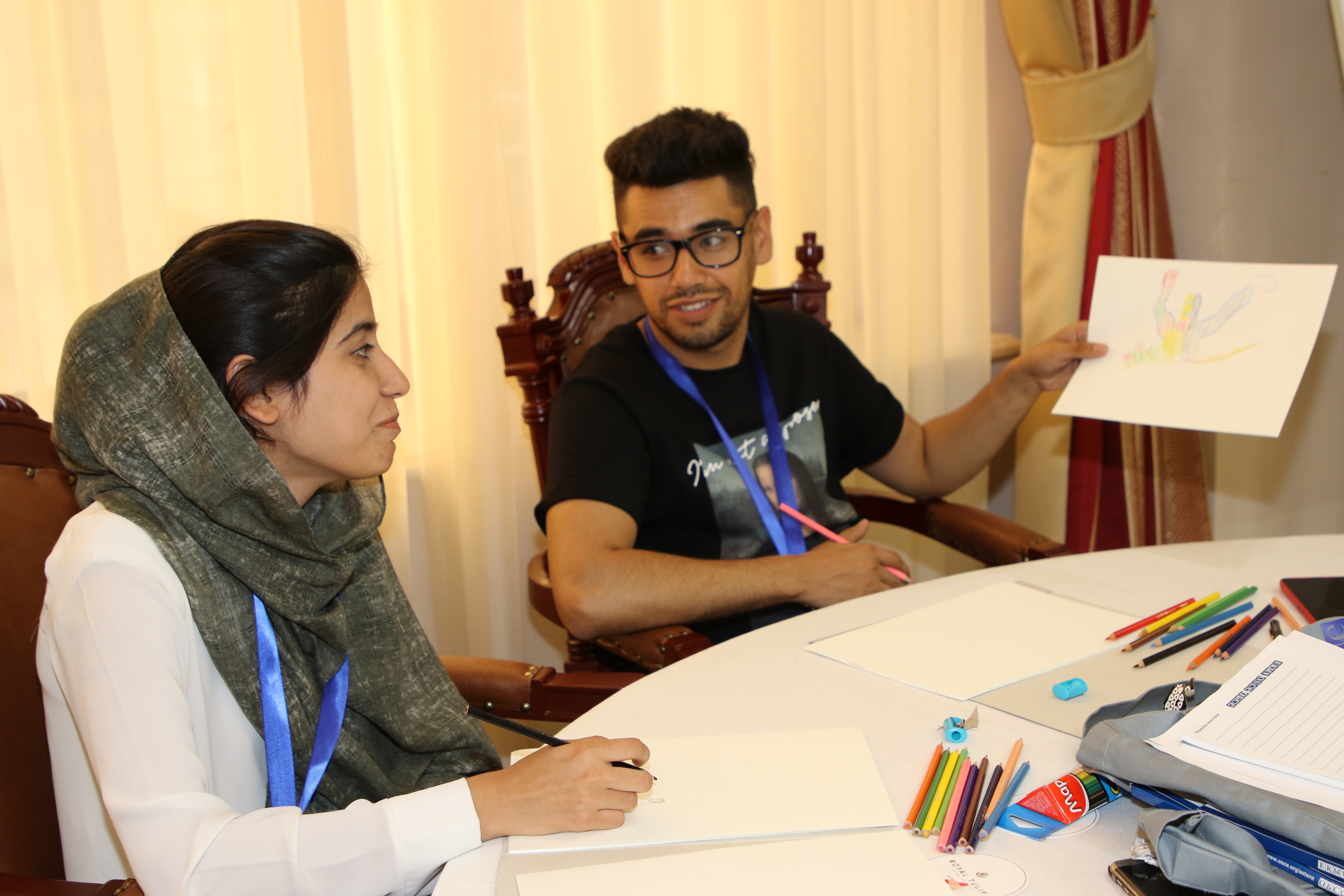 Students attending the CAYN seminar reflect on the power of communication and art by drawing a picture and giving it as a gift to each other. Almaty, 27 June 2019.
