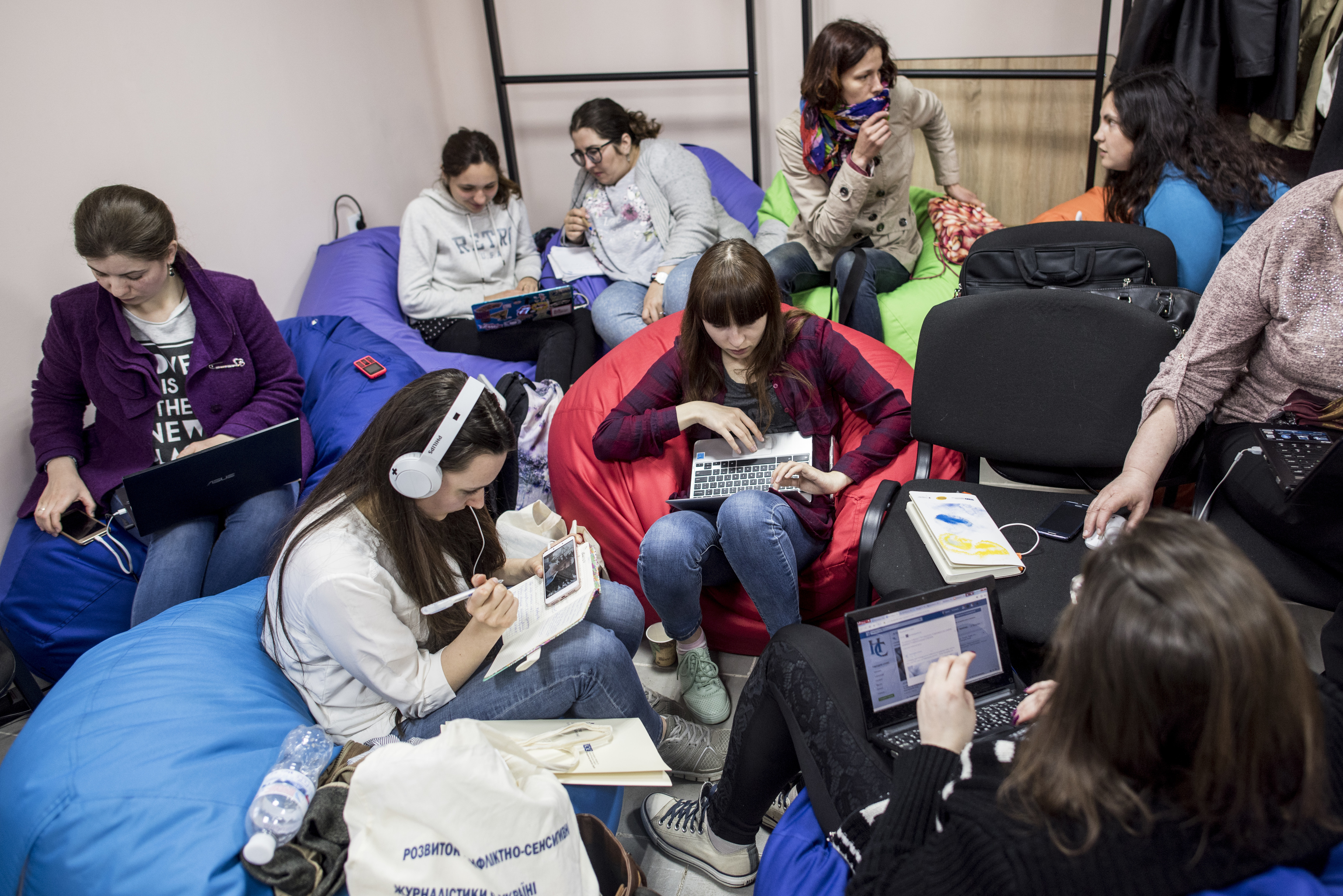 At the OSCE-supported training, journalists work on their articles after having gathered information, recordings and edited videos on their smartphones, to produce a story covering life of people in Kostyantynivka.
