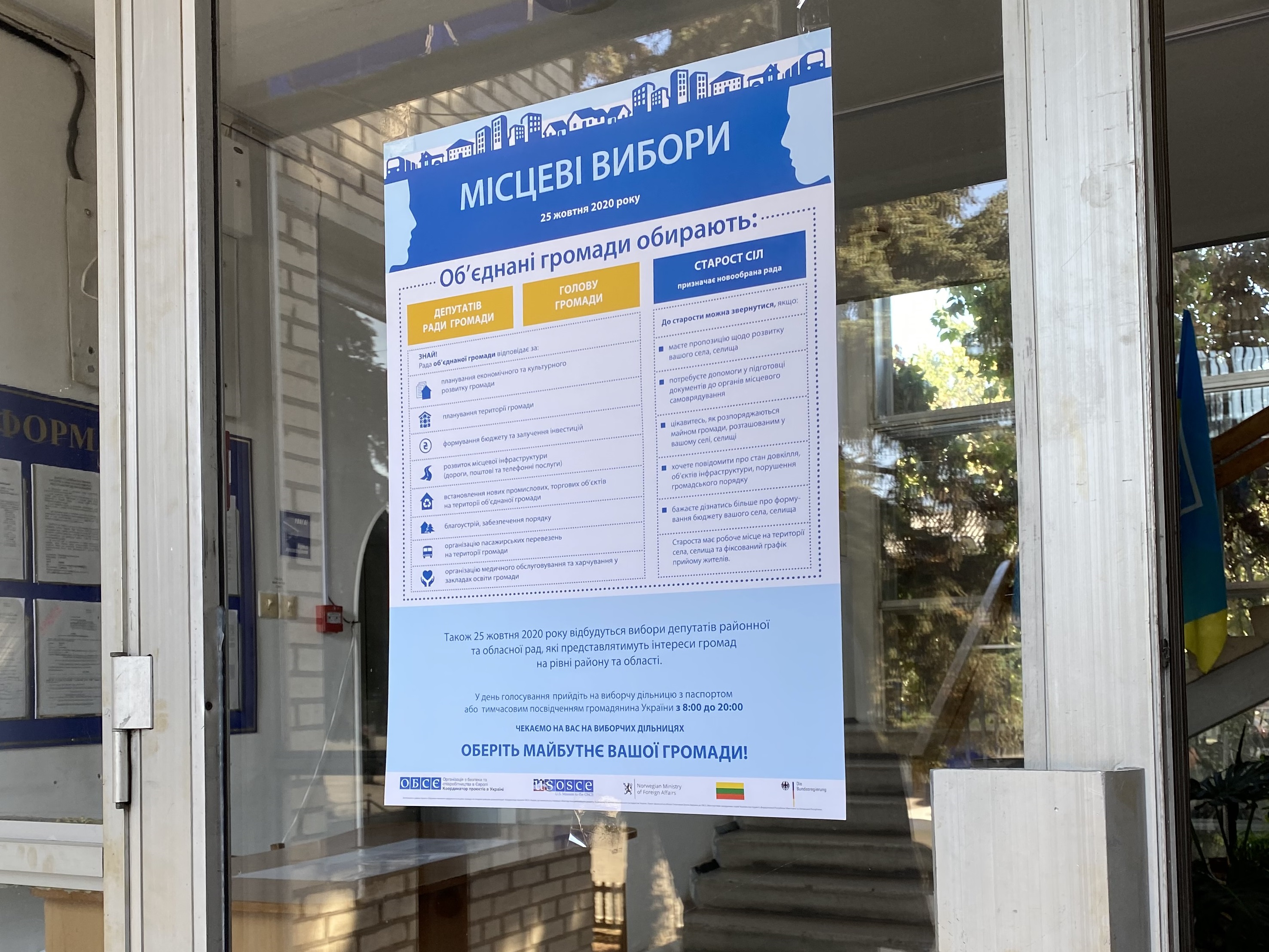 Poster, developed with the support of the OSCE Project Co-ordinator, is placed at the entrance of an administrative building in Sviatohirsk, Donetsk Oblast.