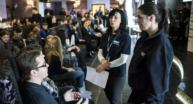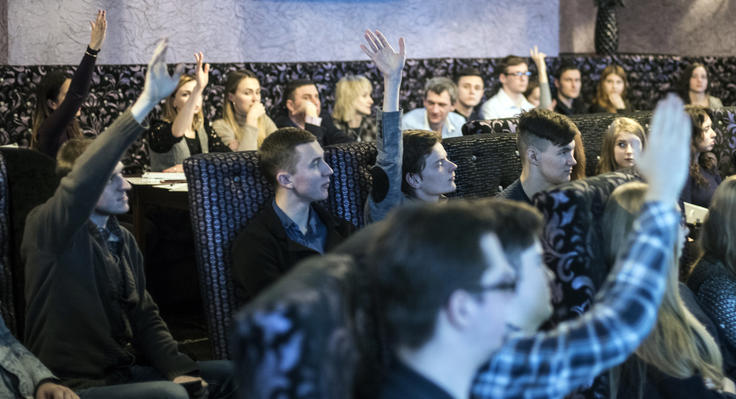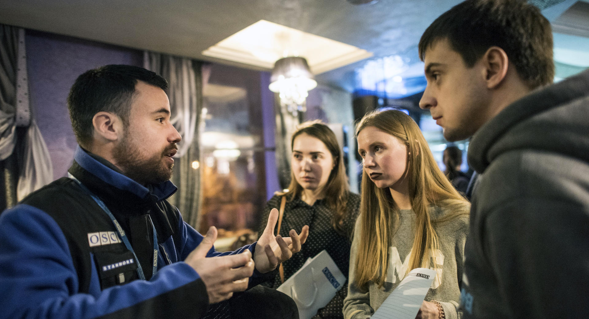 Холодным февральским вечером помещение в Луганске было полностью заполнено посетителями. Студенты, учителя и другие заинтересованные жители этого города приняли публичное приглашение от Специальной мониторинговой миссии ОБСЕ в Украине (СMM) и присоединились к обсуждениям того, чем именно занимается СММ. В обсуждениях принял участие Первый заместитель Главы Миссии Александр Хуг вместе с другими наблюдателями.