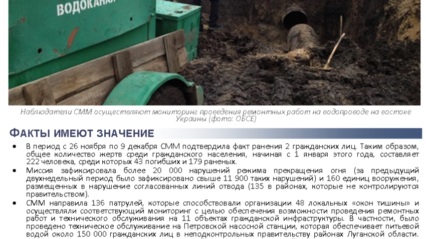 В отчете представлен обзор работы Специальной мониторинговой миссии ОБСЕ (СММ), последние события и новости по состоянию на 10 декабря 2018 года.