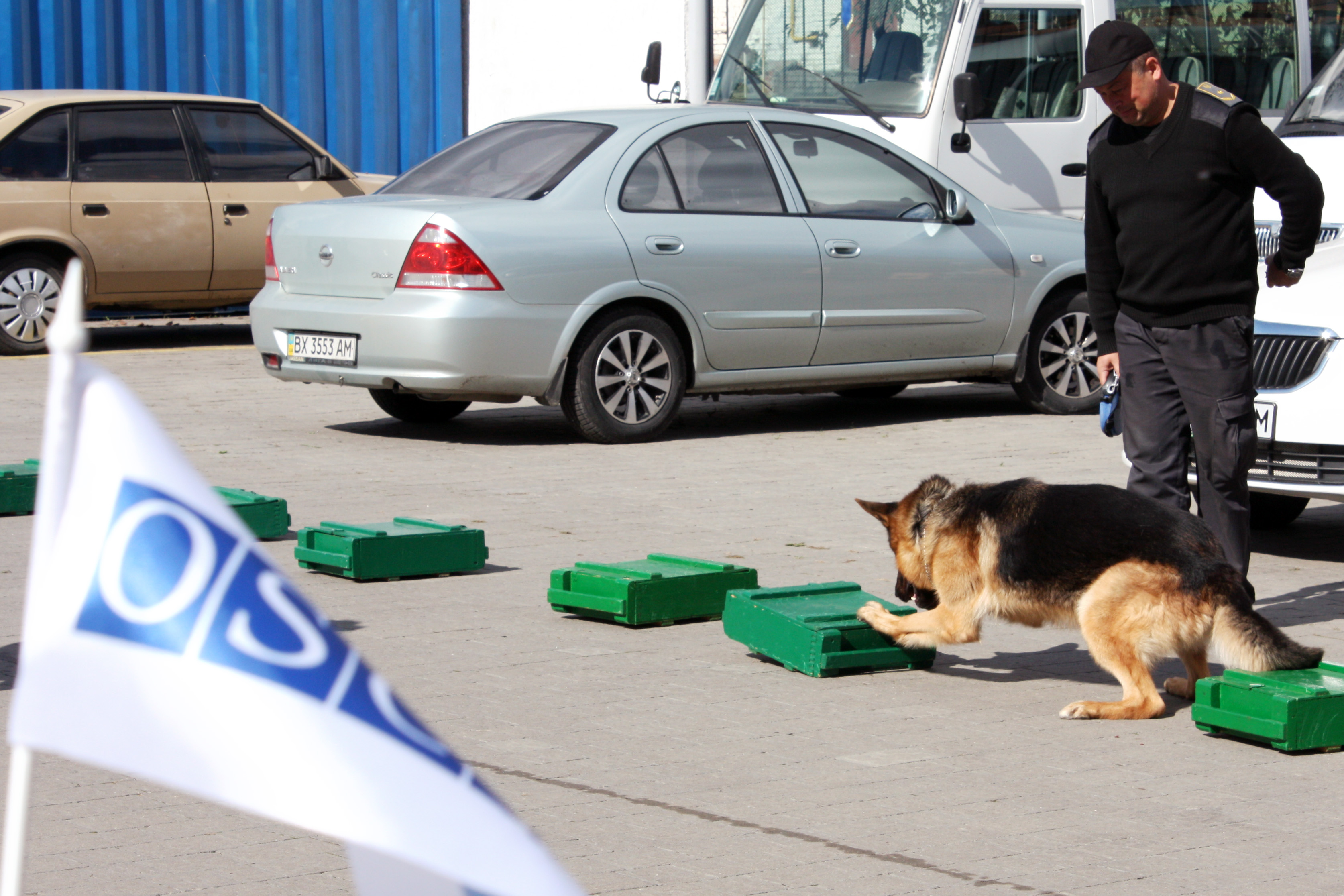 A canine expert demonstrates the detective ability of a trained dog during a regional workshop on building the capacity of customs authorities in detecting the illegal trafficking of hazardous waste, pesticides, ozone-depleting substances and endangered plants and animals. The workshop was co-organized by the Office of the Co-ordinator of OSCE Economic and Environmental Activities in Khmelnytskyi, Ukraine, 1 October 2014.