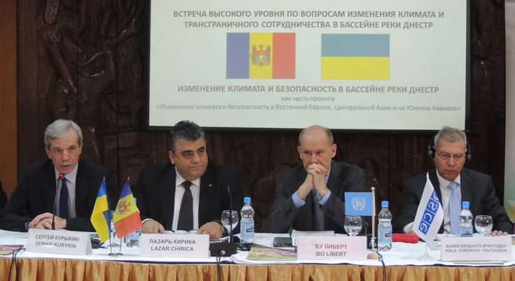 (L-r) Serhiy Kurykin The Deputy Minister of Ecology and Natural Resources of Ukraine; Lazar Chirica, Moldova's Deputy Minister of Environment; Bo Libert, UNECE Regional Advisor on Environment and Yurdakul Yigitguden, Co-ordinator of OSCE Economic and Environmental Activities, during a high-level event on the trans-boundary climate change adaptation strategy, Kyiv, 23 April 2015.