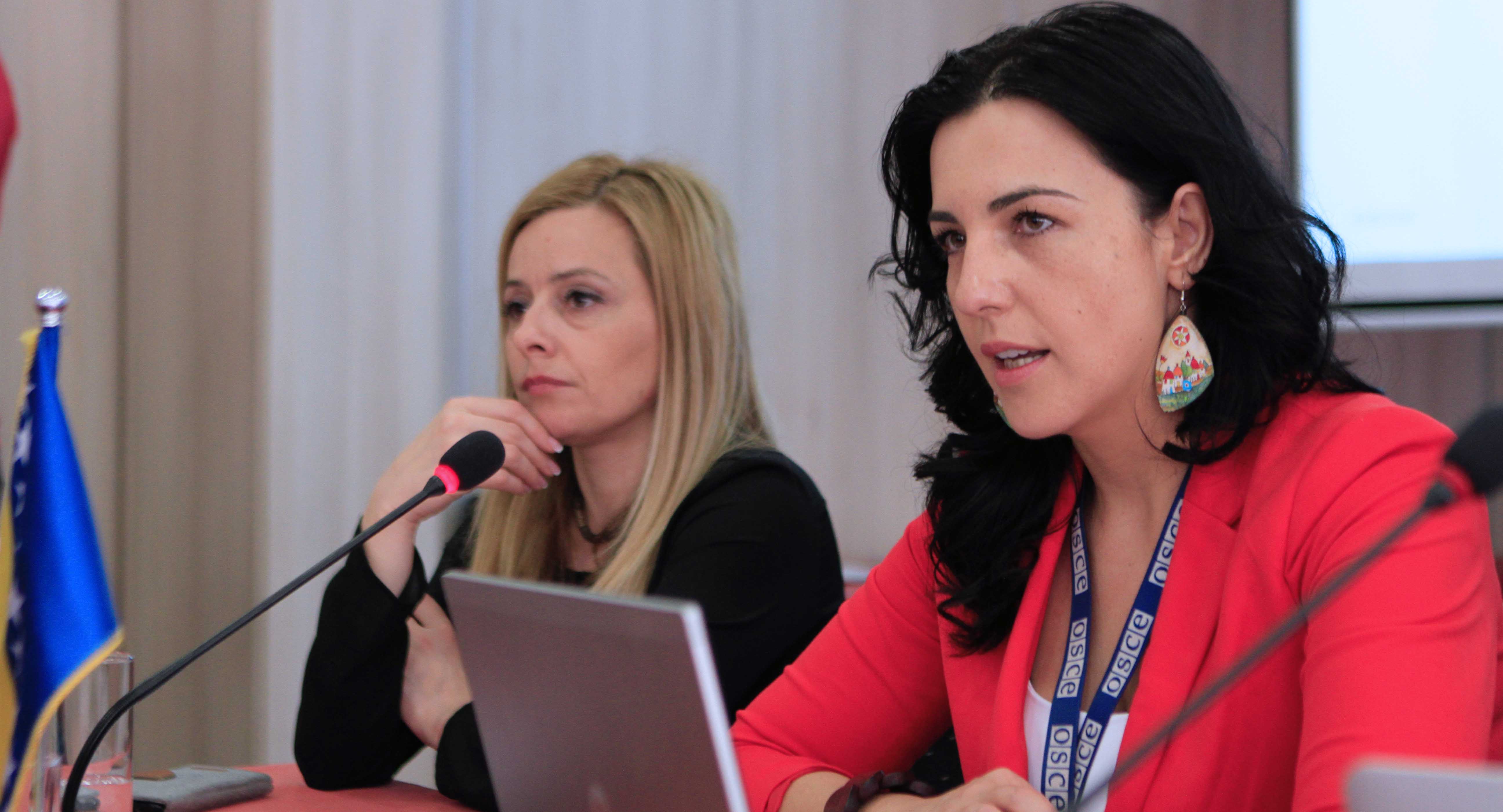 Selma Zekovic (r), Security Co-operation Unit, OSCE Mission to Bosnia and Herzegovina, welcoming participants at the Youth Summit on the Role of Youth in Countering Violent Extremism, Teslic, 18 April 2016