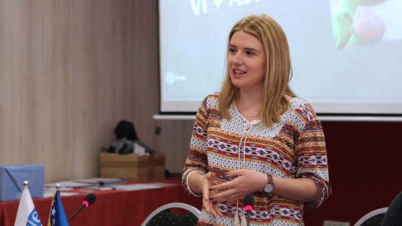 Aldin Krivan, member of SupergradjaniKe social media team, explaining to participants the role of youth in countering hate speech online, Youth Summit on the Role of Youth in Countering Violent Extremism, Teslic, 18 April 2016.