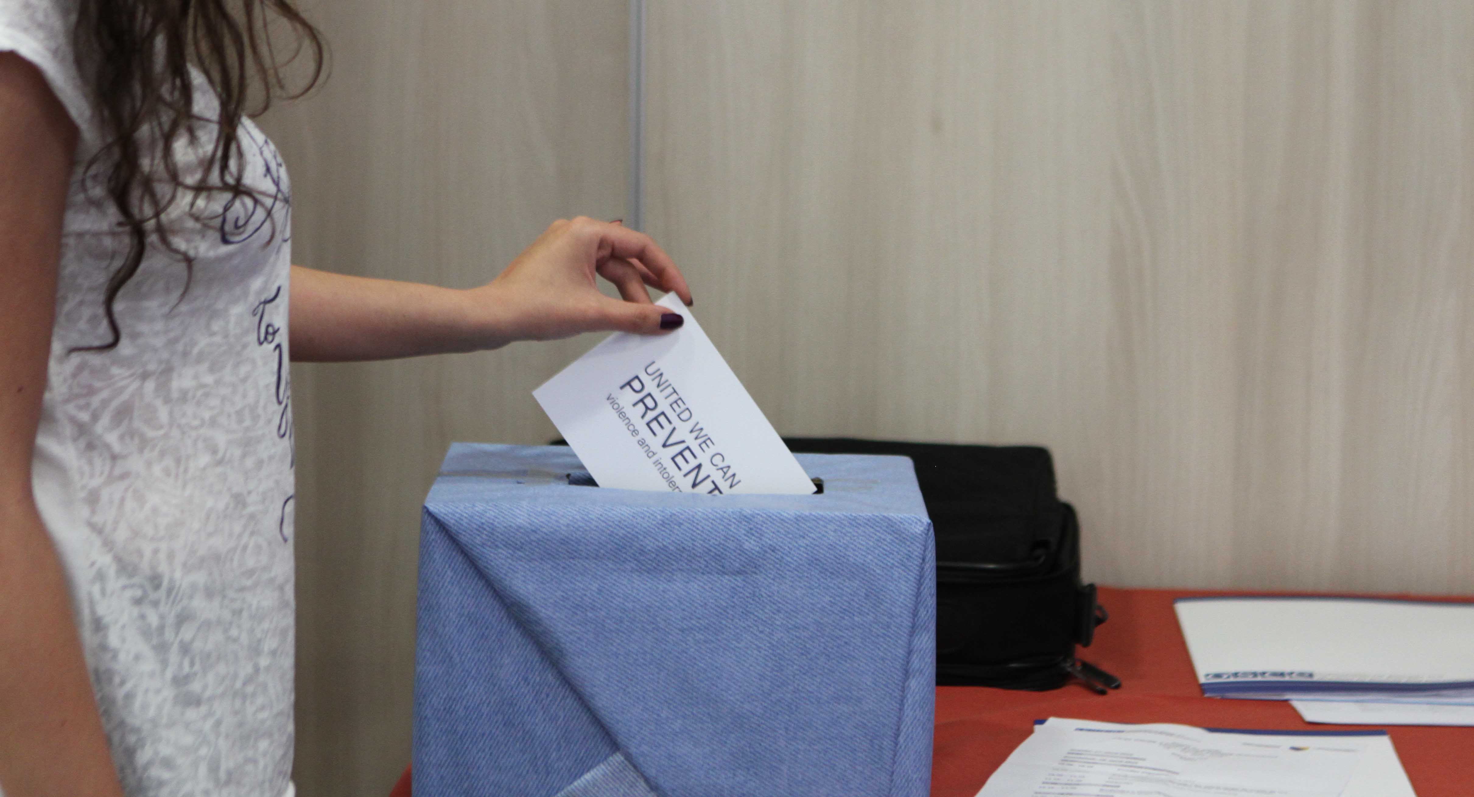 Participants sending their messages to the OSCE United in Countering Violent Extremism (#UnitedCVE) campaign, during a Youth Summit on the Role of Youth in Countering Violent Extremism, Teslic, 18 April 2016