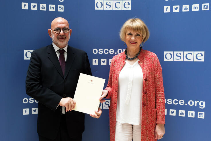 H.E. Andreas Ignatiou, Ambassador and Permanent Representative of Cyprus to the OSCE, with the OSCE Secretary General Helga Maria Schmid, Vienna, 4 October 2023.