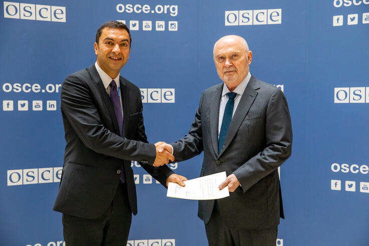 H.E. Ivan Gospodinov, Ambassador and Permanent Representative of Bulgaria to the OSCE, with the OSCE Secretary General Feridun H. Sinirlioğlu, Vienna, 3 November 2025.