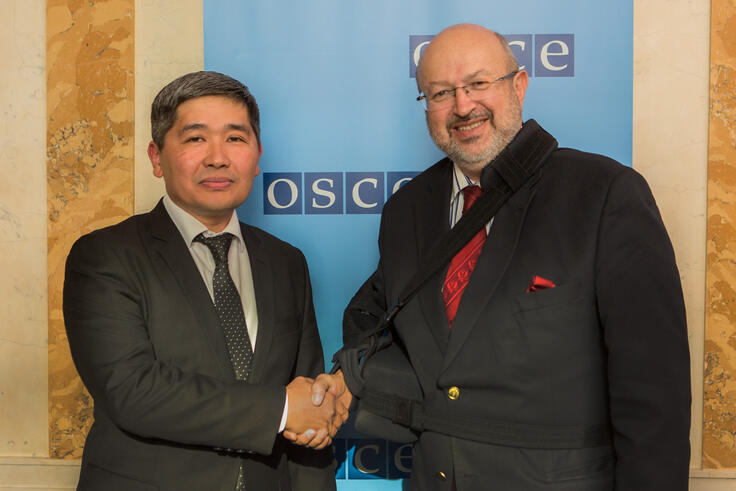 H.E. Bakyt Djusupov (r), Ambassador of Kyrgyzstan, with OSCE Secretary General Lamberto Zannier, Vienna, 10 April 2017.