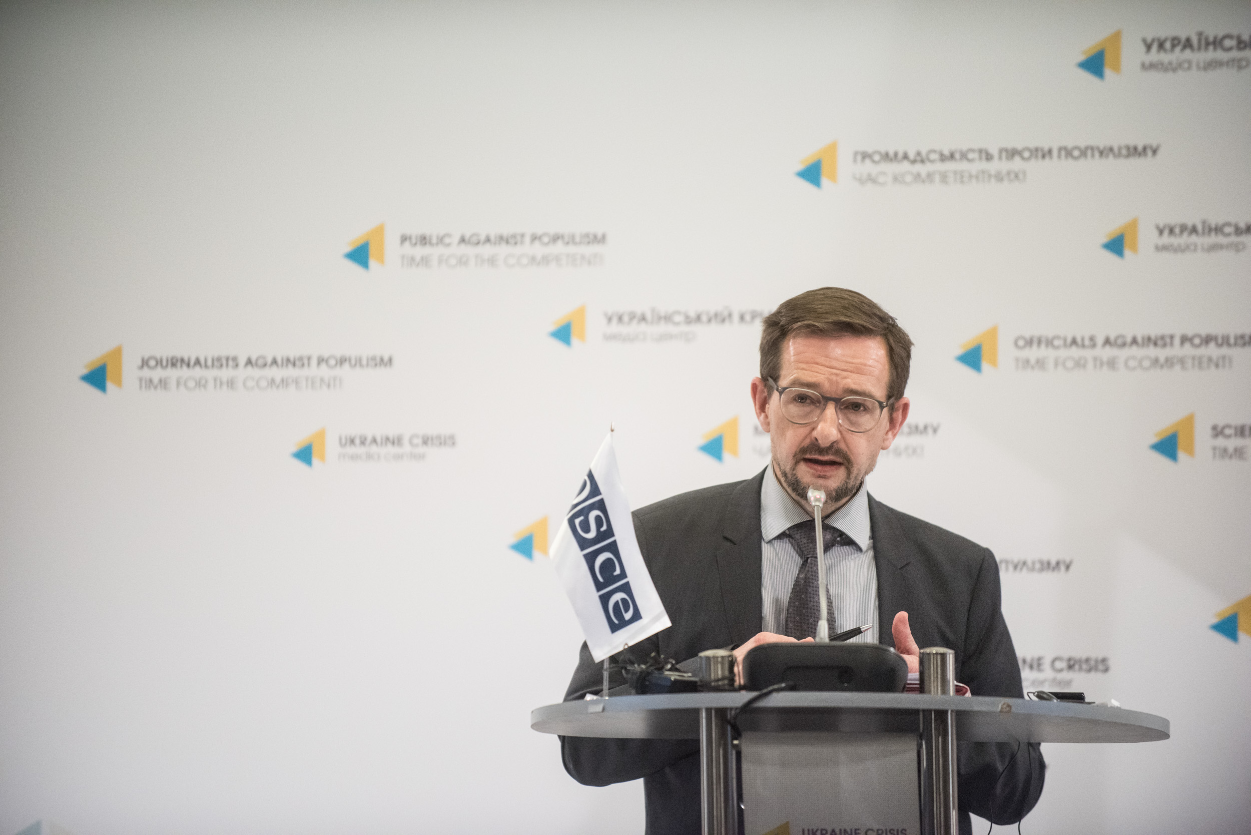 Thomas Greminger, OSCE Secretary General speaks to the media during a news briefing, Kyiv, 14 September 2017.