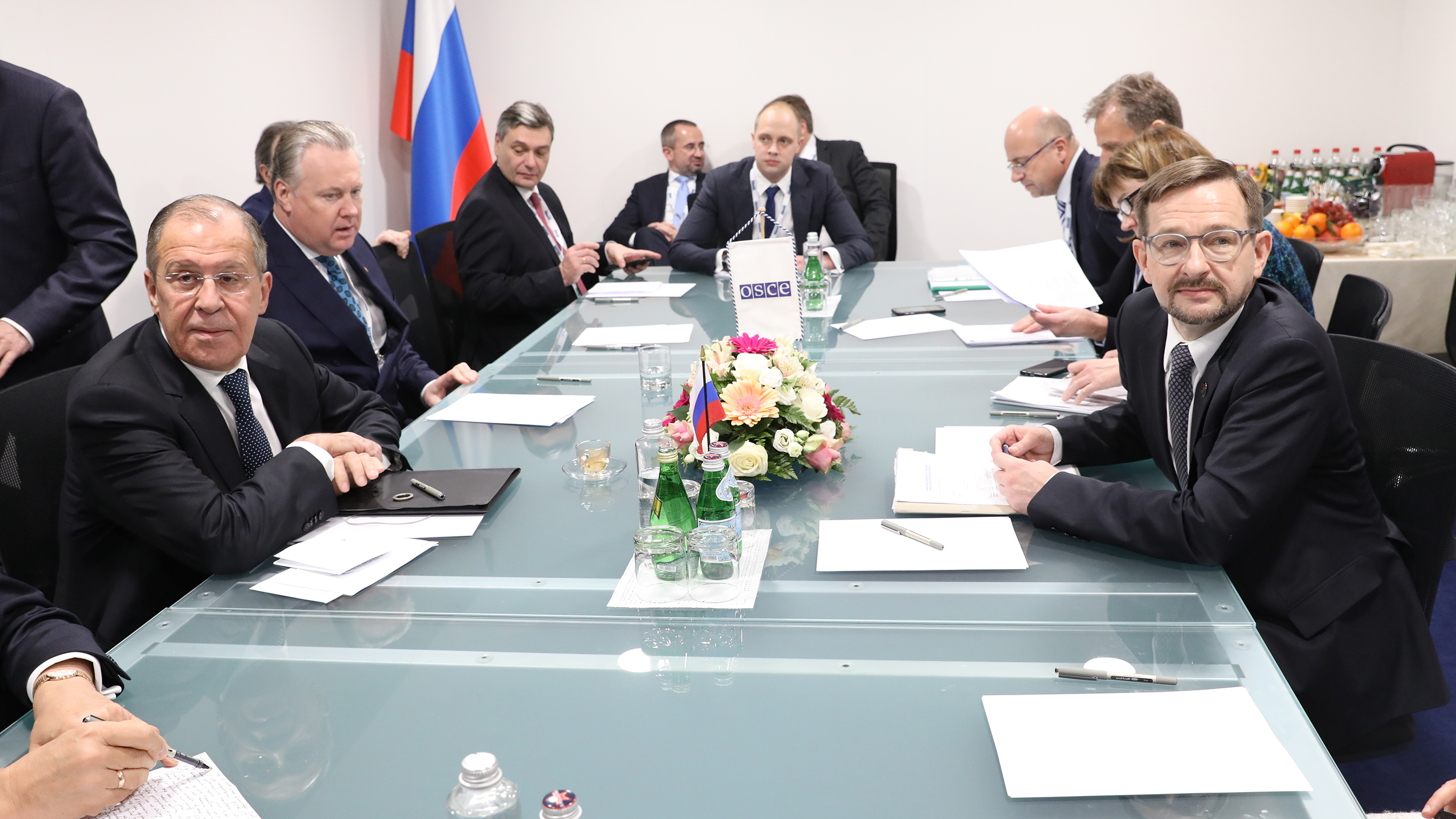 Russian Foreign Minister Sergey Lavrov (l) and OSCE Secretary General Thomas Greminger during a bilateral meeting, 25th OSCE Ministerial Council, Milan, 6 December 2018.