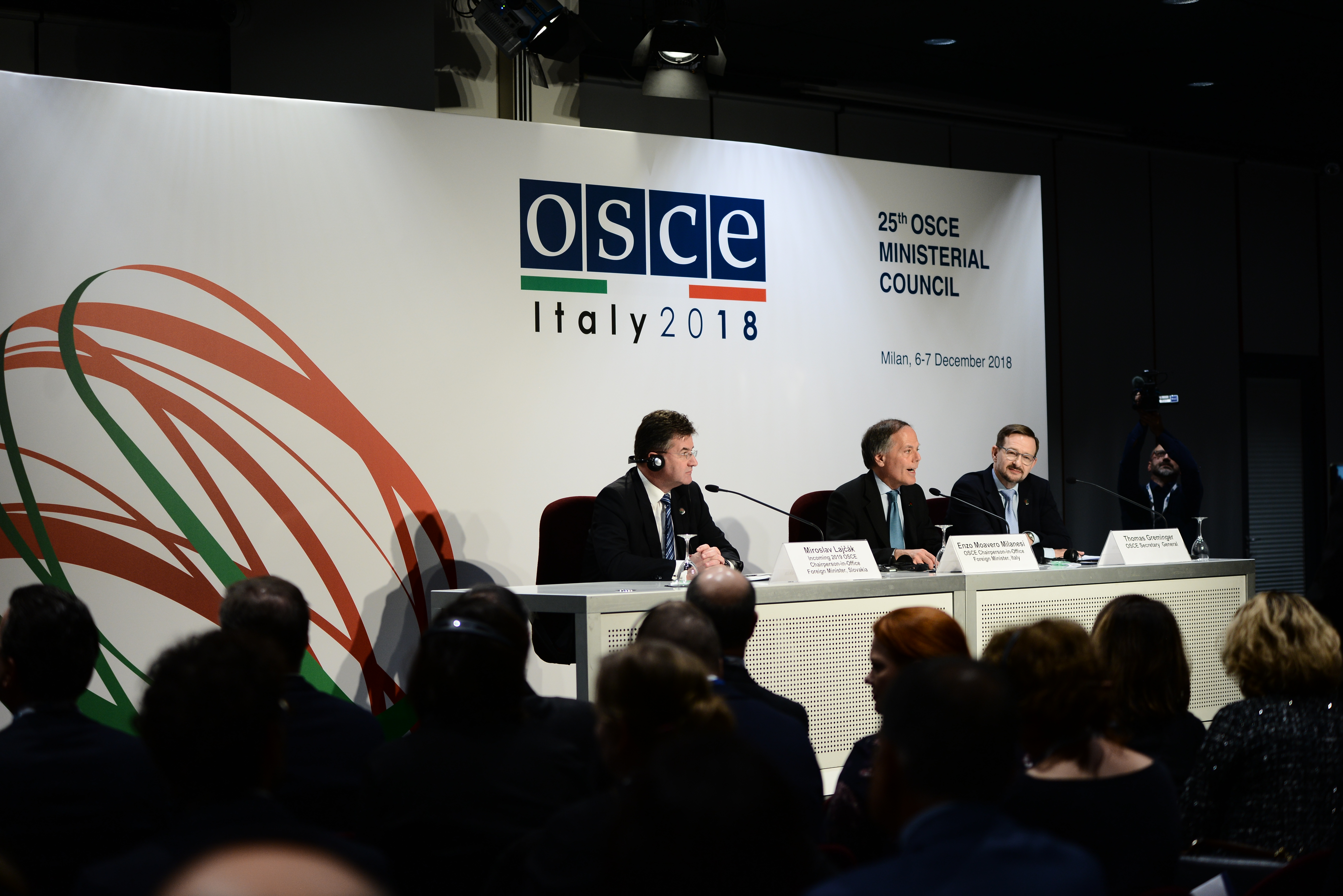 (l-r) Miroslav Lajčák, Minister of Foreign and European Affairs of the Slovak Republic, Chairperson-in-Office and Italian Minister of Foreign Affairs Enzo Moavero Milanesi and OSCE Secretary General Thomas Greminger during the final press conference, 25th OSCE Ministerial Council, Milan, 7 December 2018.