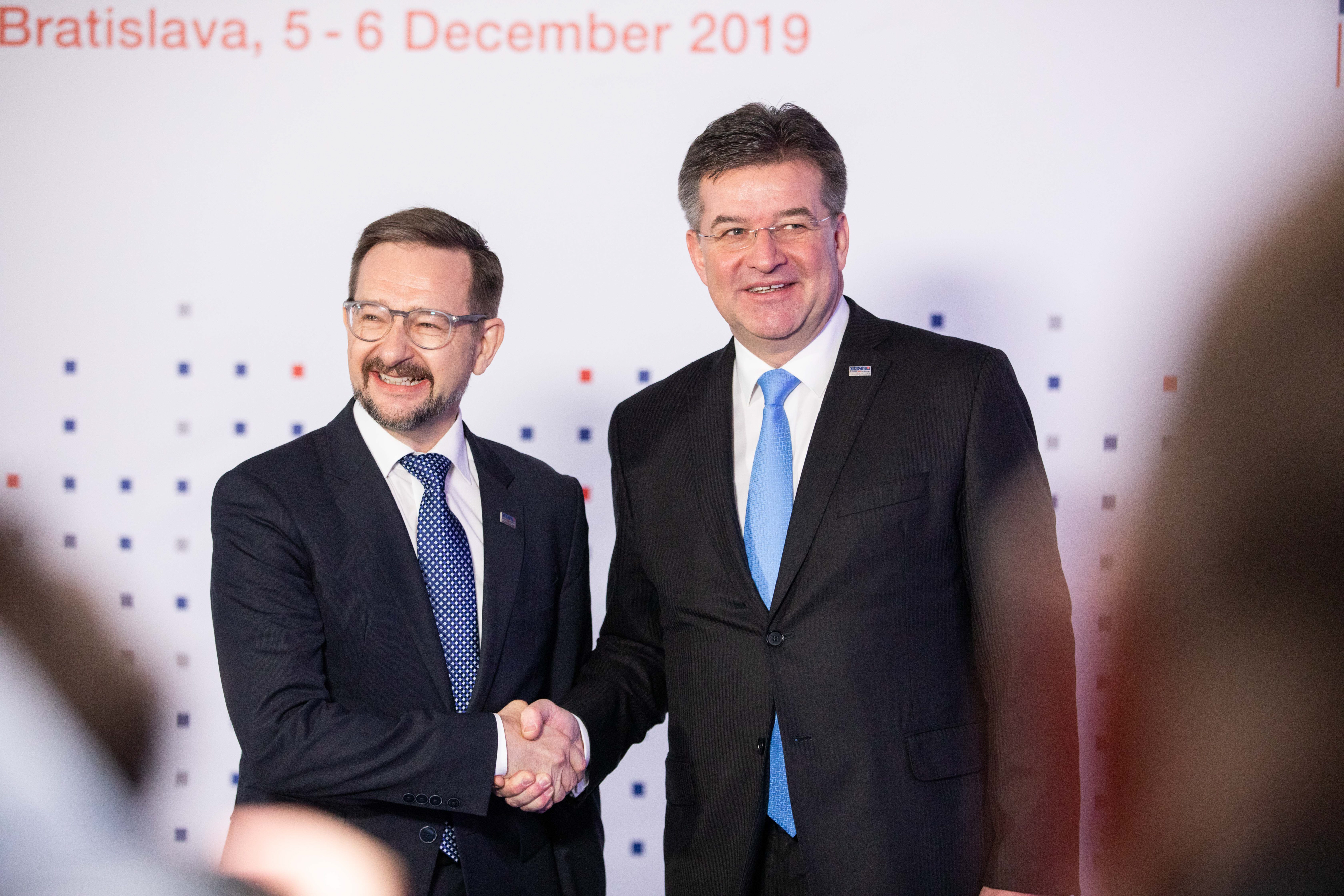 OSCE Secretary General Thomas Greminger (l) and Miroslav Lajčák, Chairperson-in-Office and Slovakia’s Foreign and European Affairs Minister, at the 26th OSCE Ministerial Council, Bratislava, 5 December 2019.