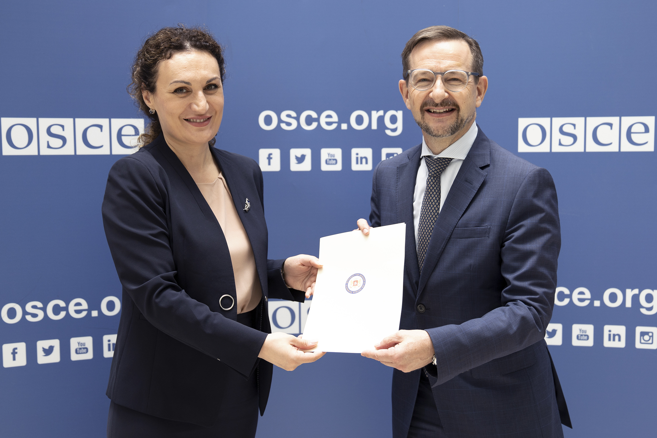 H. E. Ketevan Tsikhelashvili (l), Ambassador and Permanent Representative of Georgia to the OSCE, with OSCE Secretary General Thomas Greminger, Vienna, 8 July 2020.