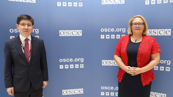 H.E. Abat Fayzullaev (l), Ambassador and Permanent Representative of the Republic of Uzbekistan to the OSCE, with Tuula Yrjölä, Officer-in-Charge / Secretary General and Director of the OSCE Conflict Prevention Centre, Vienna, 25 September 2020.
