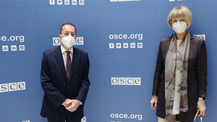 H.E. Konstantinos Kollias (l), Ambassador and Permanent Representative of Greece to the OSCE, with OSCE Secretary General Helga Maria Schmid, Vienna, 17 May 2021.