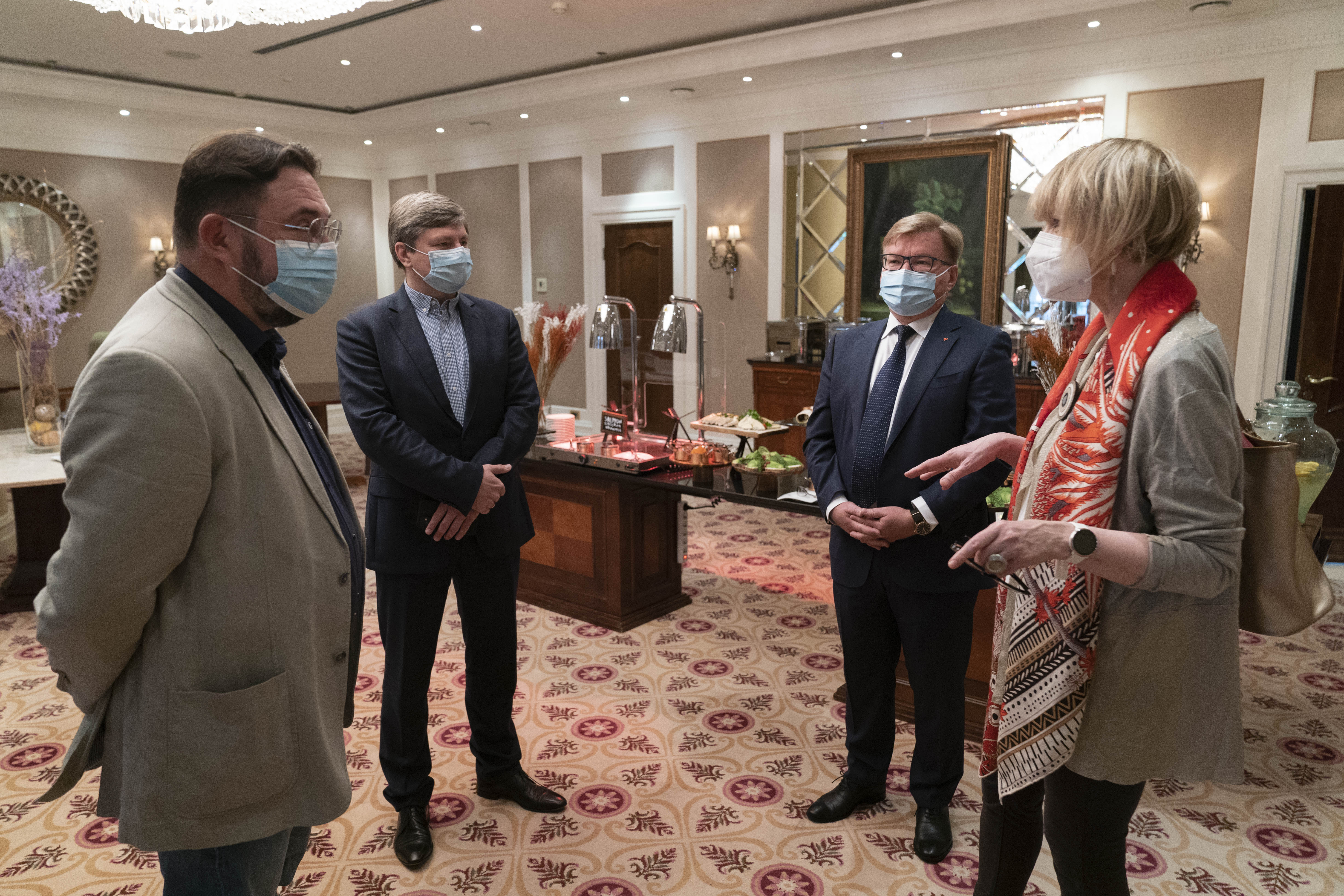 OSCE Secretary General Helga Maria Schmid meeting with Members of the Permanent Delegation of the Verkhovna Rada of Ukraine to the OSCE Parliamentary Assembly: Head of Delegation Mykyta Poturayev (left), “Servant of the People” party; Deputy Head of Delegation Artur Gerasymov (center), “European Solidarity” party; and Deputy Head of Delegation Grygoriy Nemyria (right), “Batkivshchyna” party. Kyiv, 30 May 2021.
