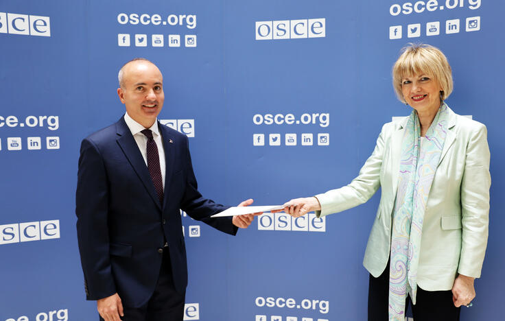 H.E. Royshan Sadigbayli (l), Ambassador and Permanent Representative of the Republic of Azerbaijan to the OSCE, with OSCE Secretary General Helga Maria Schmid, Vienna, 19 August 2021.