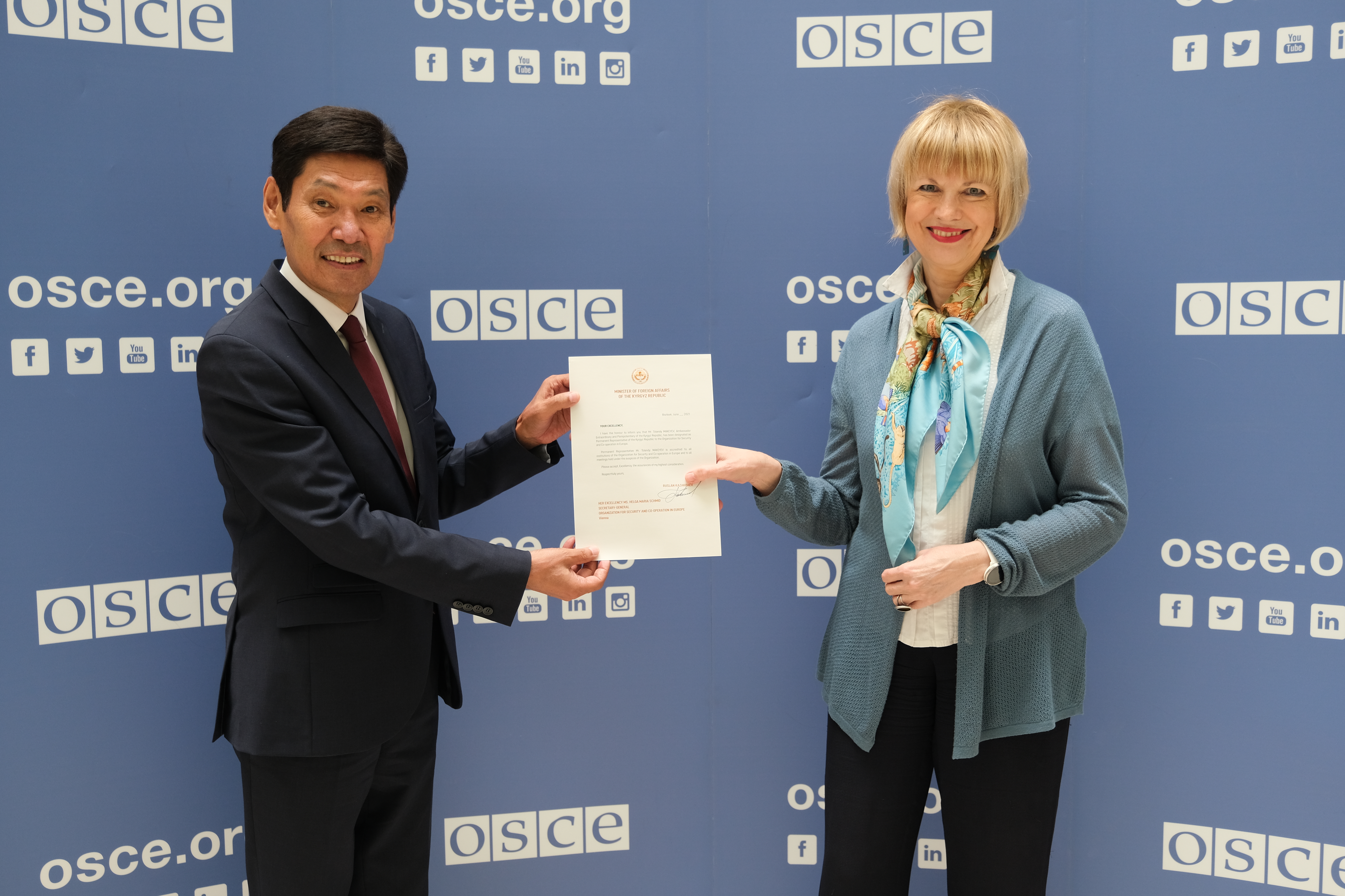 H.E. Tolendy Makeyev, Ambassador and Permanent Representative of the Republic of Kyrgyzstan to the OSCE, with OSCE Secretary General Helga Maria Schmid, Vienna, 24 August 2021.
