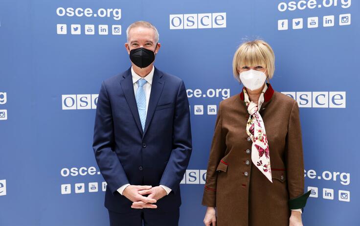 H.E. Michael Carpenter, Ambassador and Permanent Representative of the United States of America to the OSCE, with OSCE Secretary General Helga Maria Schmid, Vienna, 29 November 2021.