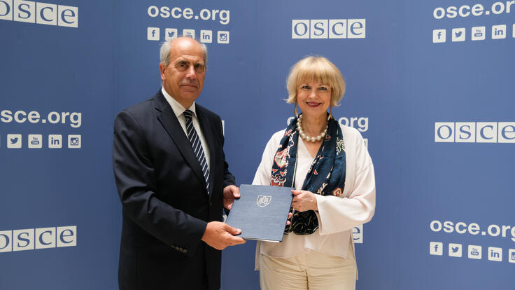 H.E Peter Burian, Ambassador and Permanent Representative of Slovakia to the OSCE, with the OSCE Secretary General Helga Maria Schmid, Vienna, 7 July 2023.