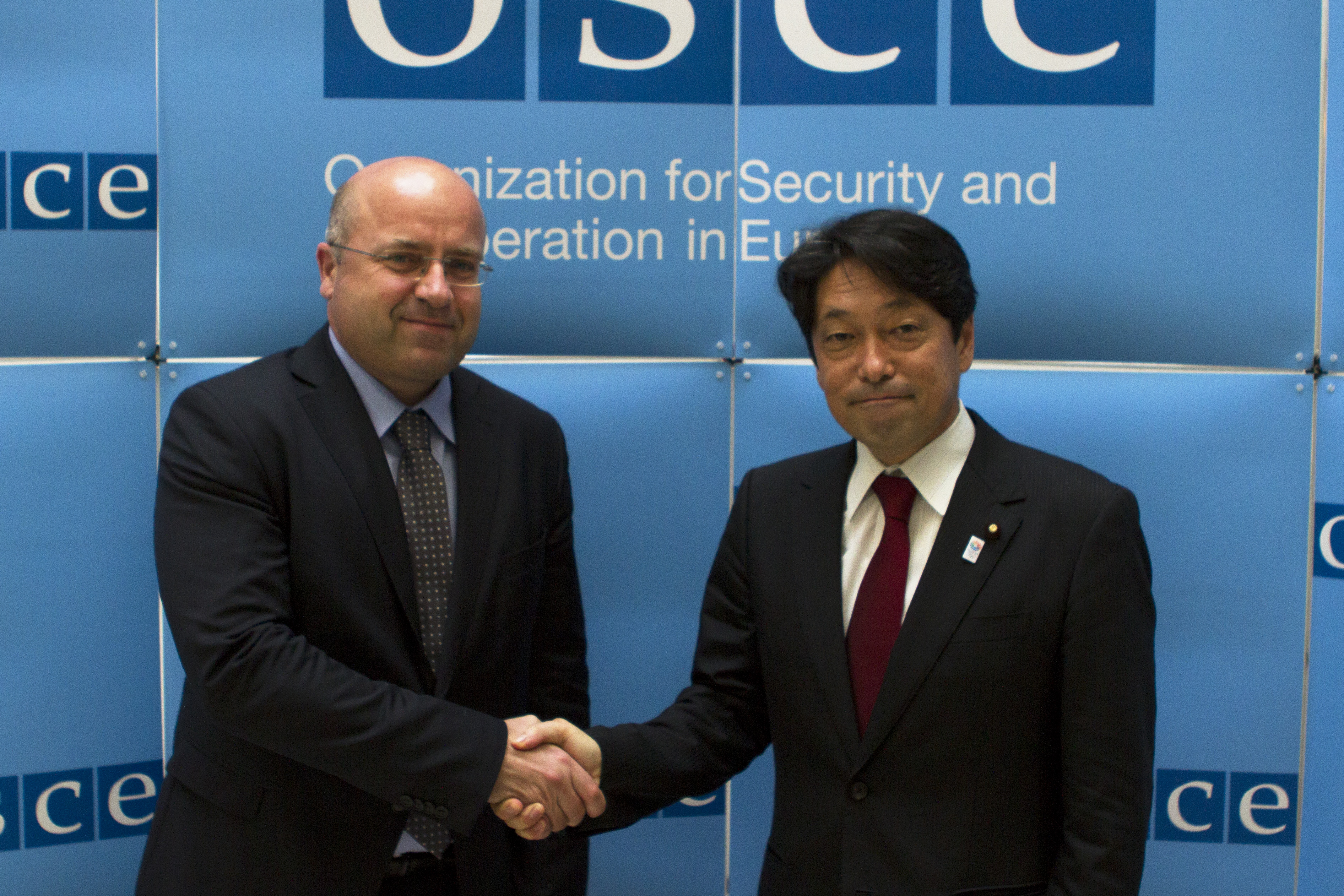 Japanese Defence Minister Itsunori Onodera (r) is greeted by the Director of the Office of the OSCE Secretary General Marcel Pesko, on an official visit to the OSCE Secretariat, Vienna, 30 July 2013.
