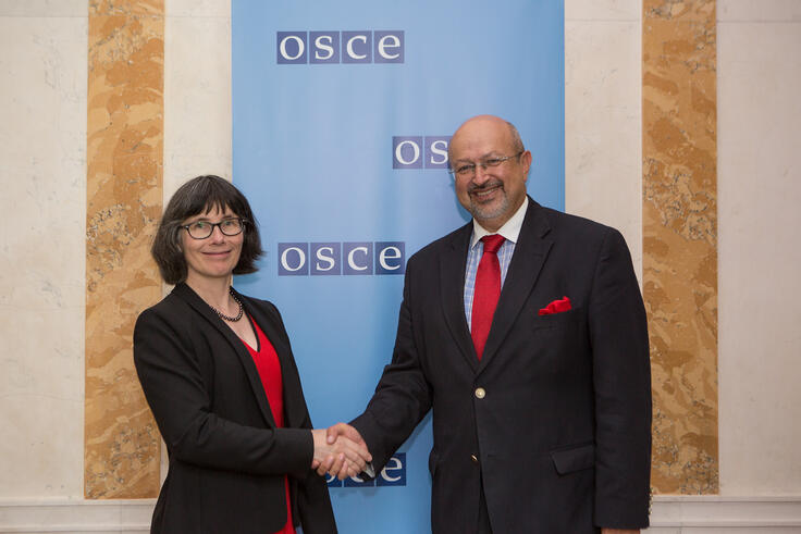H.E. Ambassador Sian MacLeod (l), Permanent Mission of the United Kingdom to the OSCE in Vienna, and the OSCE Secretary General Lamberto Zannier, Vienna, 24 August 2015.