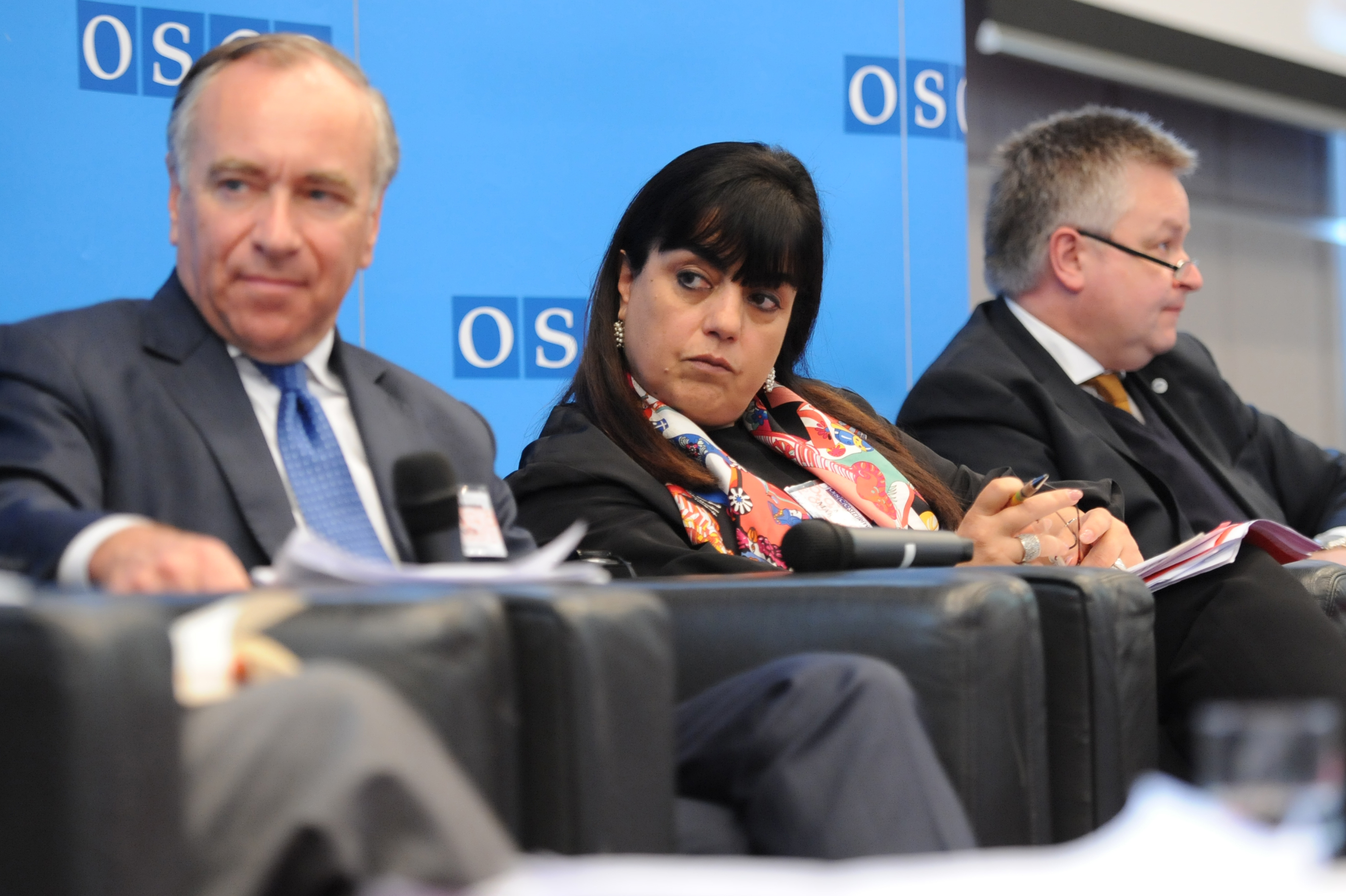 (L-r) Ambassador Fred Tanner, Senior Adviser to the OSCE Secretary General, Ambassador Mara Marinaki, Principal Adviser on Gender and UNSCR 1325 (2000) of the European Union, and Director Michael Georg Link, Office for Democratic Institutions and Human Rights (ODIHR) at the OSCE Security Days event on gender equality and security, Vienna, 13 November 2015.